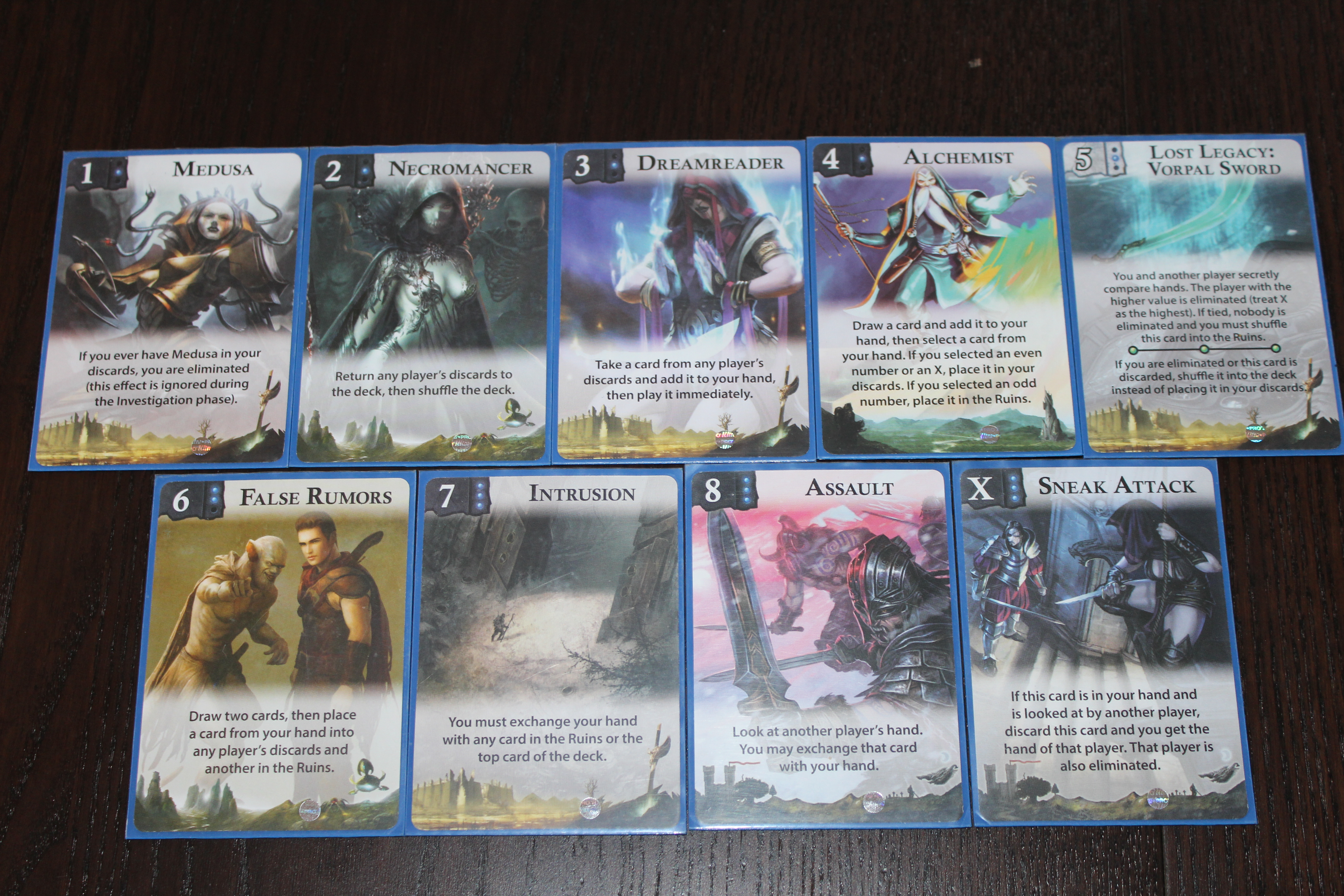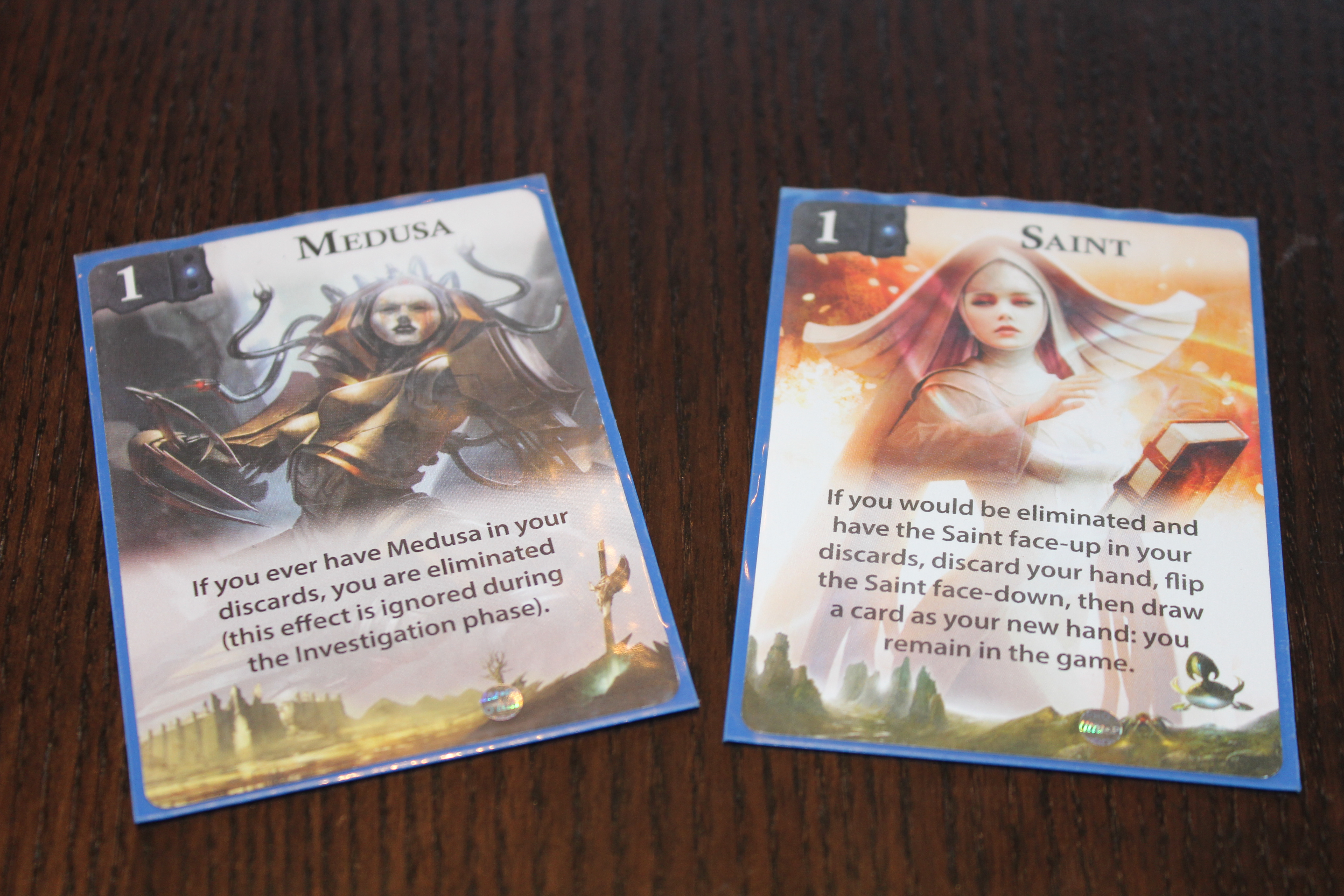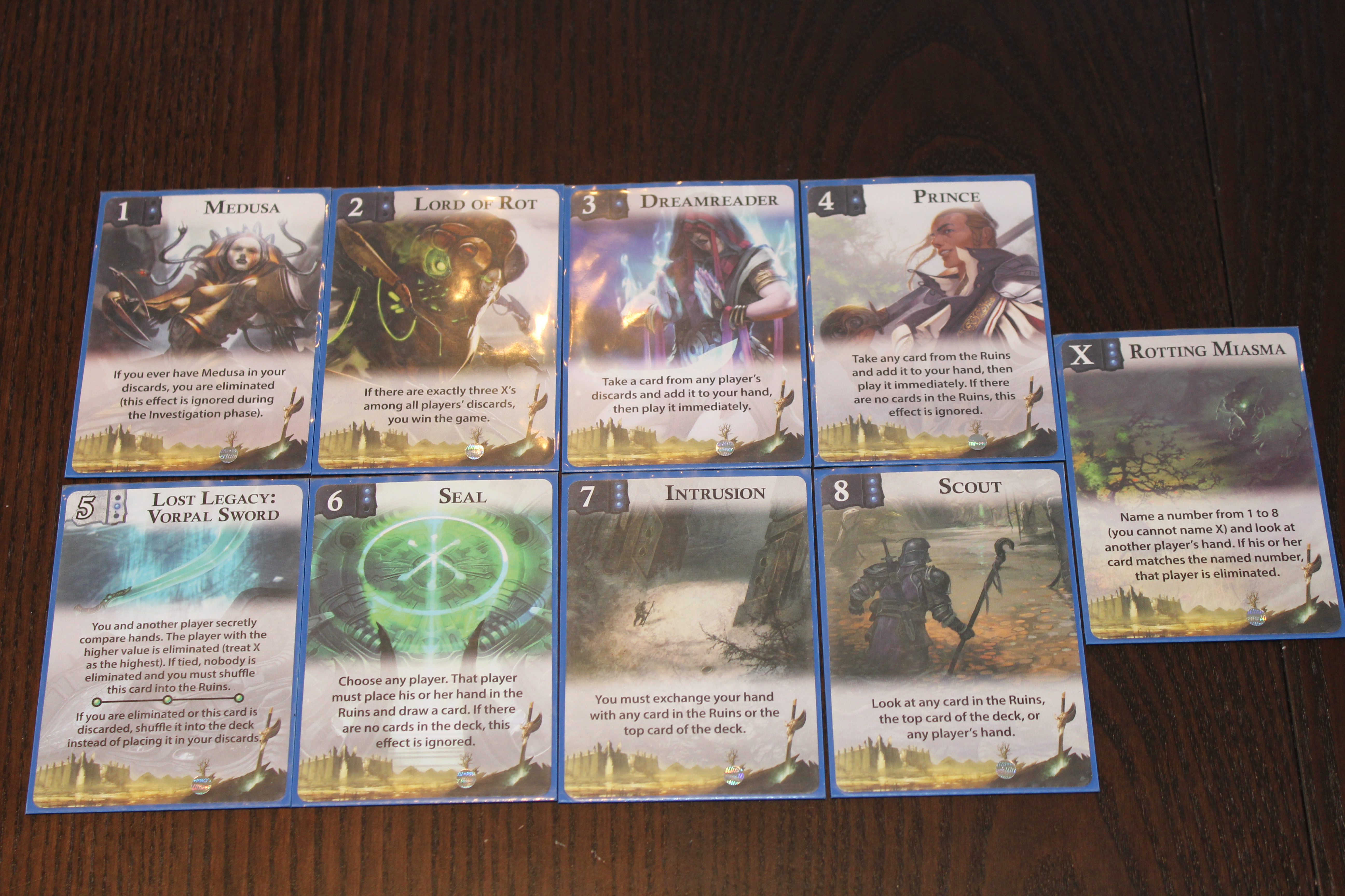 Like I said, I really like this set. People continually spend time adding good or bad cards to their or other players’ discard piles (respectively, I hope) only to be thwarted by the Necromancer, forcing them to shuffle their discard back into the deck (save the Necromancer, otherwise the game would last forever). This also brings in the Curse, the first card that allows you to guess a player’s hand and eliminate them if you’re right. Few cards cause a general consternation among players faster than the Wound, though. Not only is it an X (an overwhelmingly undesirable card to have during the Investigation Phase), but you can accidentally eliminate yourself if you are forced to play two Wounds (or are Wound-ed by another player). Furthermore, this Lost Legacy is playable, meaning you’re not hosed if you draw it.