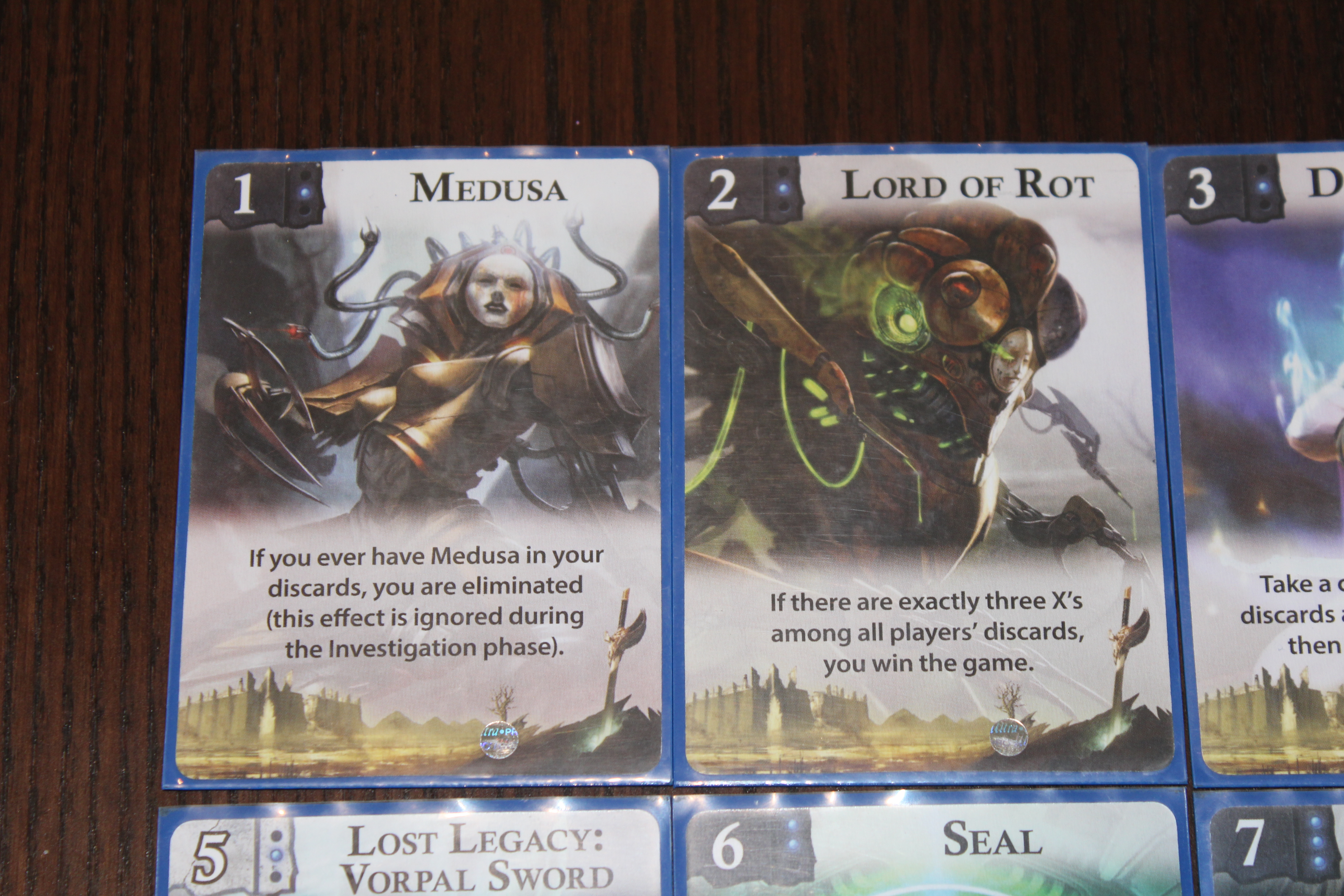 Enough lore. Let’s get down to business. If you play with this set you are unlikely to investigate much. If you play the Medusa on yourself, you lose. Immediately. The only way to save yourself is the Seal, and even then if you’re not paying attention you can Prince the Medusa straight out of the Ruins. This is a hilarious thing that has happened several times, as the Prince lets you immediately play a card straight from the ruins, and as soon as someone plays the Medusa on themselves, we start clapping. Like the Curse, Rotting Miasma lets you guess another player’s hand, eliminating them if you’re successful. However, unlike Curse, the Rotting Miasma has a massive drawback — if all three are played, a player can summon the Lord of Rot to win instantly, in one of the most satisfying win conditions the game allows. Like, it’s the best. Intrusion is also a fun card just for getting rid of other cards. Suddenly, you can “give” someone the Medusa.