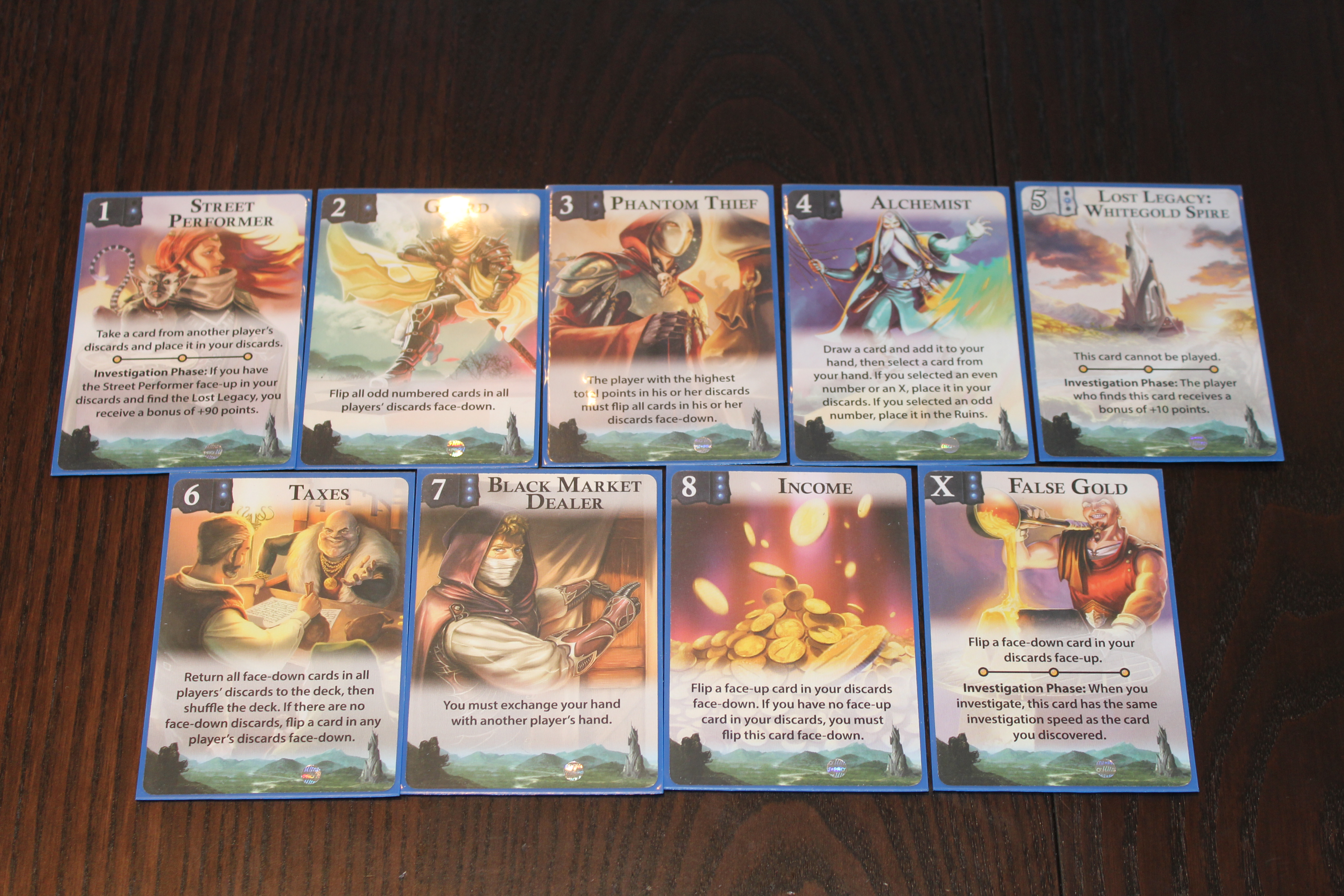 And now for something completely different. Literally. The Whitegold Spire takes the traditional “eliminating players” paradigm that we’ve grown so fond of and completely turns it on its head. This game version is all about $$$. While each card still maintains its Investigation Speed, the number is also how many points the card is worth in the endgame. After the Investigation Phase, players compare how many points they’ve earned and the highest scorer wins. It’s odd.