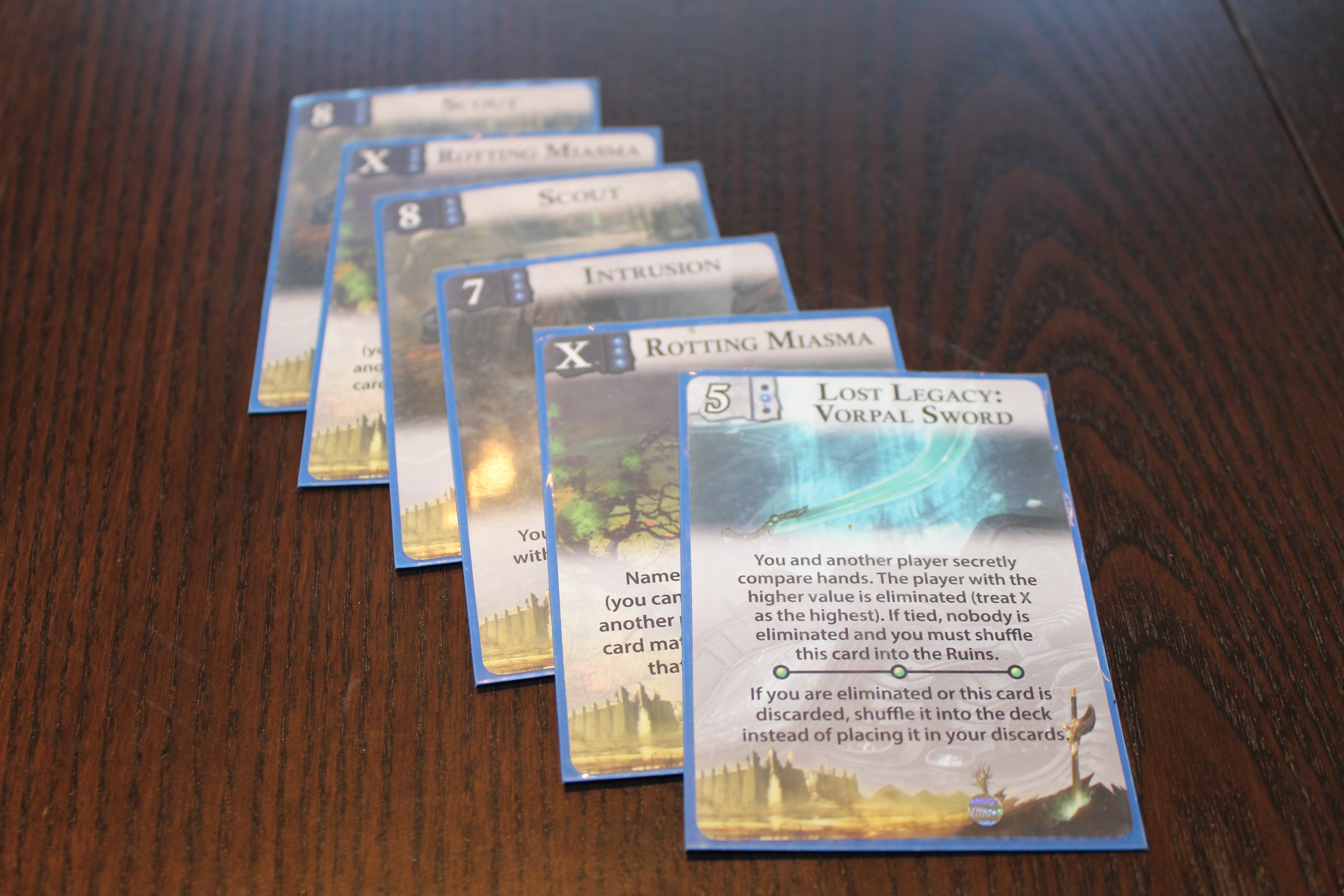 This Lost Legacy, however, is fascinating. Instead of it being mostly useless, it’s an offensive powerhouse with the right cards. Once played, you compare hands with another player. The higher card is eliminated, with X being the highest. The best part is that after elimination, the Lost Legacy is shuffled back into the deck to kill again. Forever. We call this getting “Vorped”. If there’s a tie, it’s sort of awkwardly shuffled into the Ruins. You try to avoid that happening. Beware one specific situation, though. There are very few things worse than Vorping another player when you have the 1, only to find out that they have the 2. While they DO lose, they also reveal their card to everyone else, who then must assume that your card is the 1. You may have killed them, but you’ll be joining them soon.