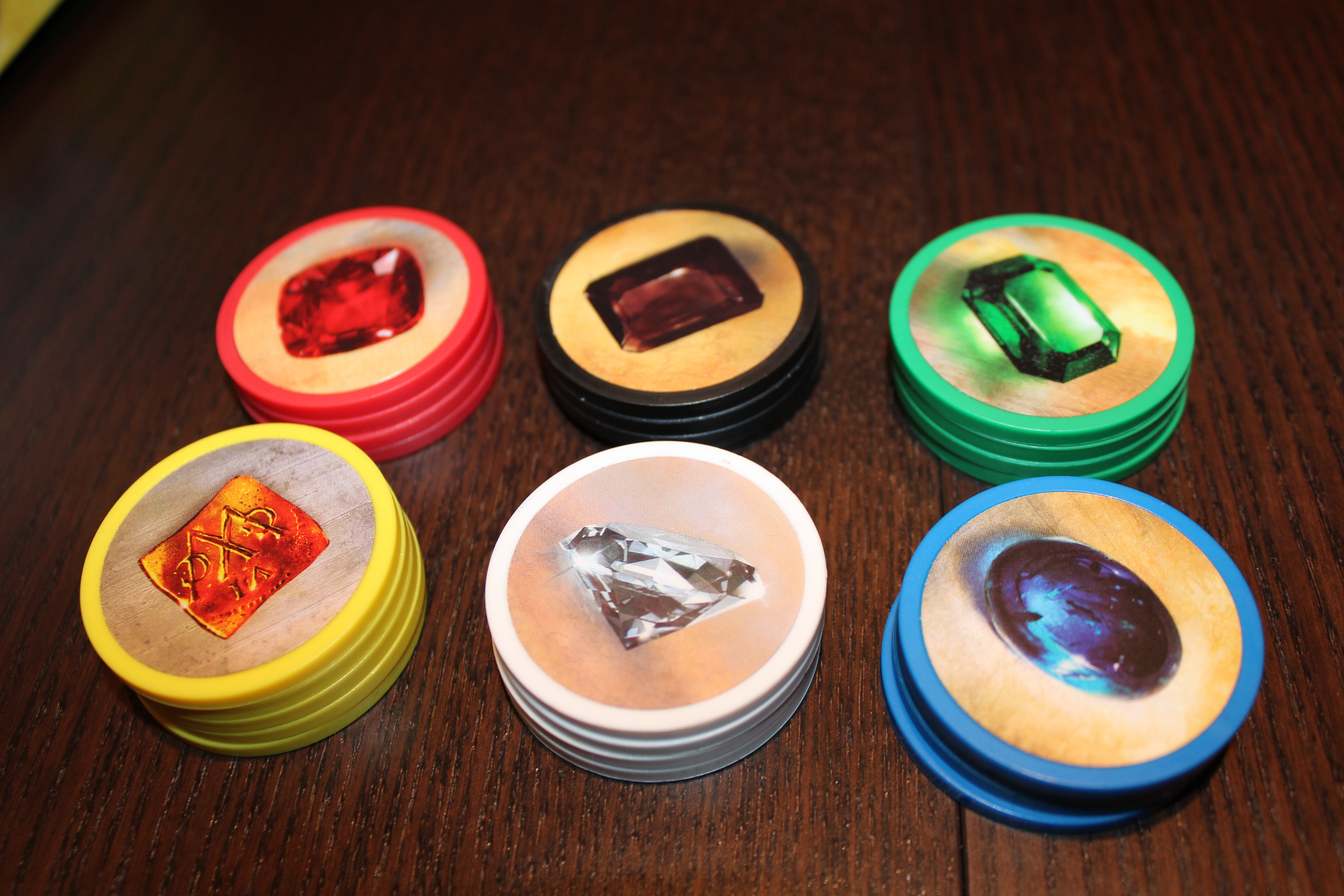 - Chips! These are your gems. Set them aside somewhere where all players can grab them. Use five non-gold gems for 3 players, and four non-gold gems for 2 players. The gems come in six colors: