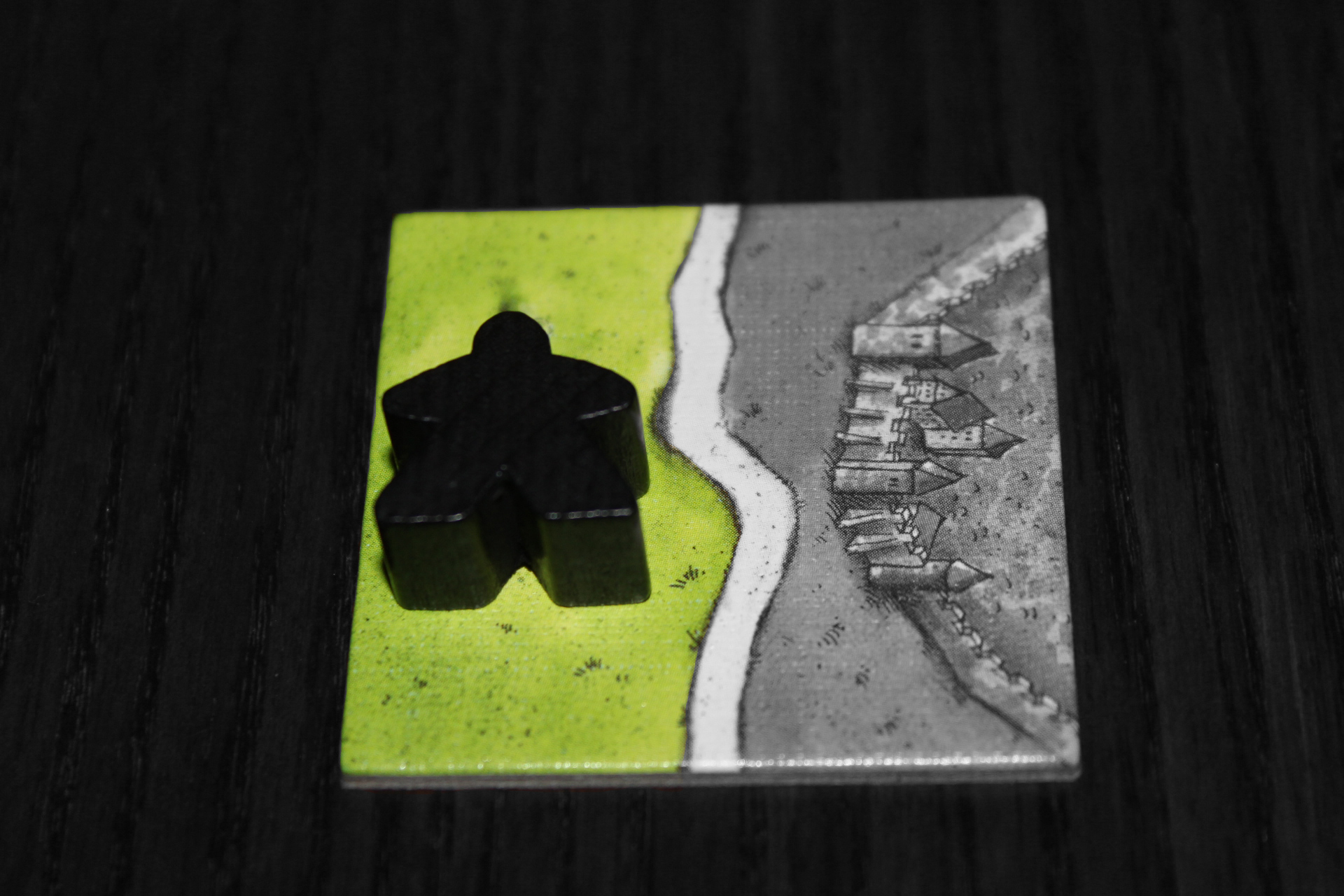 These are called meeples, colloquially (“my people”), and each person gets 8 in their color of choice. However, they must sacrifice one of them to the vengeful gods of scoring points, so place one of each players’ meeples on the scoreboard on the 0. This is all very straightforward, but on the plus side, you’re ready to start! Let’s talk gameplay.