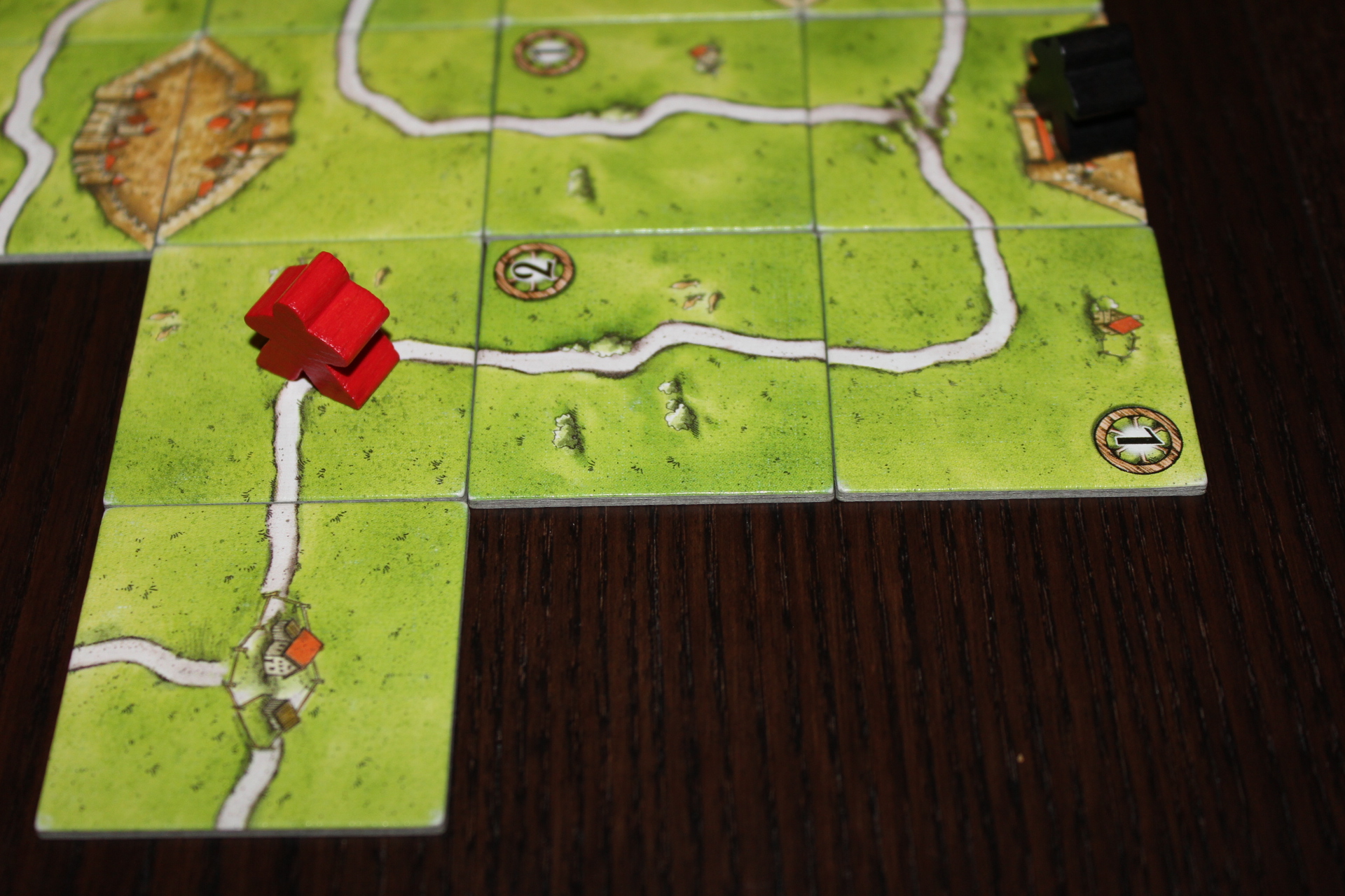 Should you complete a road, you score 1 point per tile in that road. This means if you manage to have a road loop back through a tile twice, that tile only counts for one point (difficult but possible). However, if you do not complete the road before the end of the game, it is incomplete and you are sad. Incomplete roads are still worth 1 point per tile in that road, though, so you’ll probably get over it.