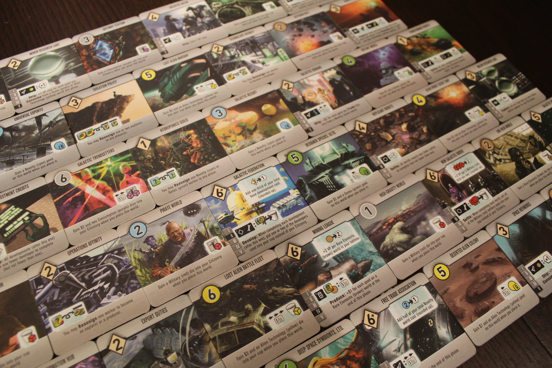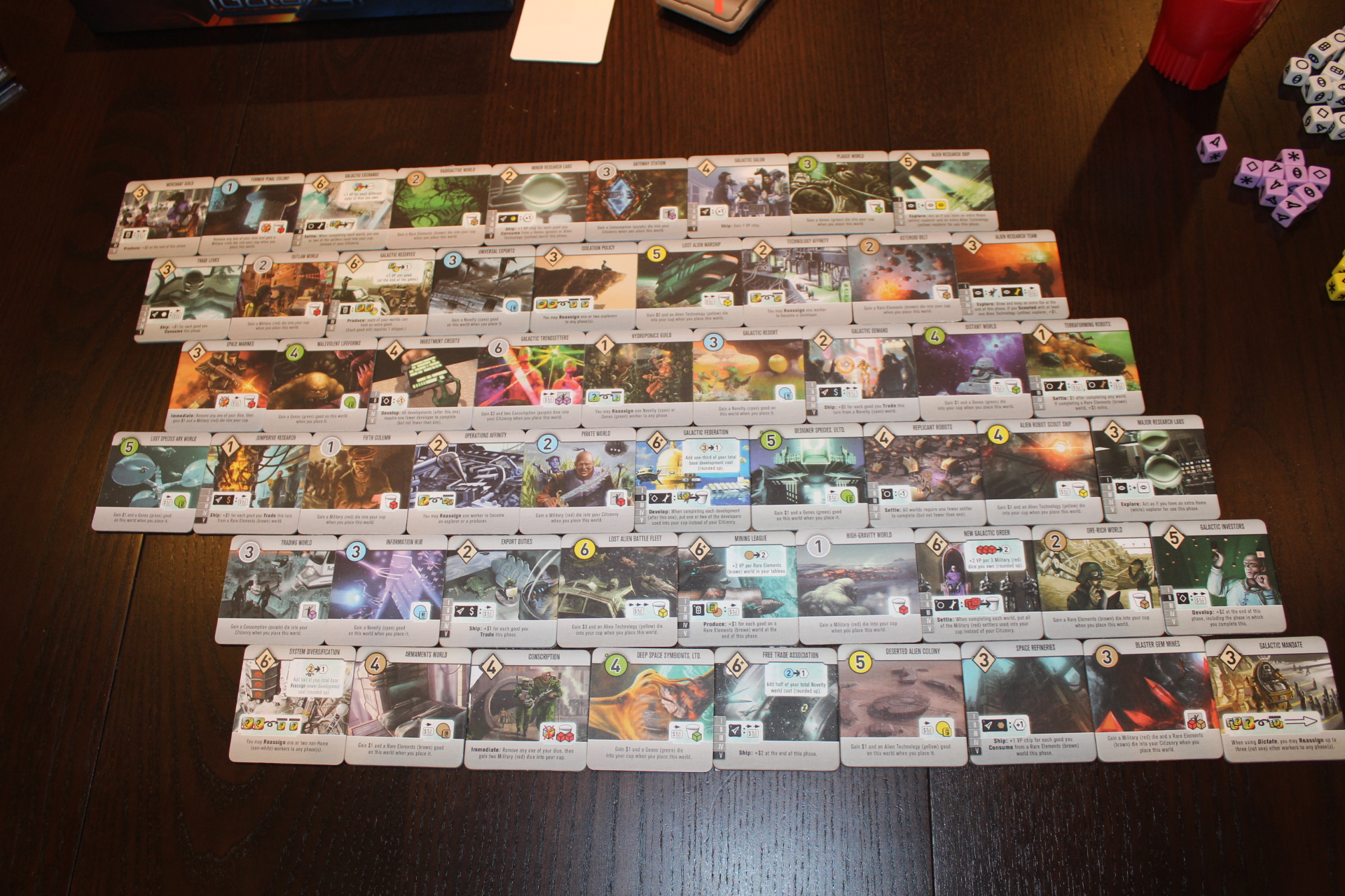 Developments usually offer sweet powers, like extra Reassign abilities or abilities that give you money or let you act as though you have extra dice in certain phases. Additionally, some developments cost “6+”, meaning that they cost 6, but are worth potentially more than 6 points at the end of the game (your score is costs of worlds in your tableau + VP chips).