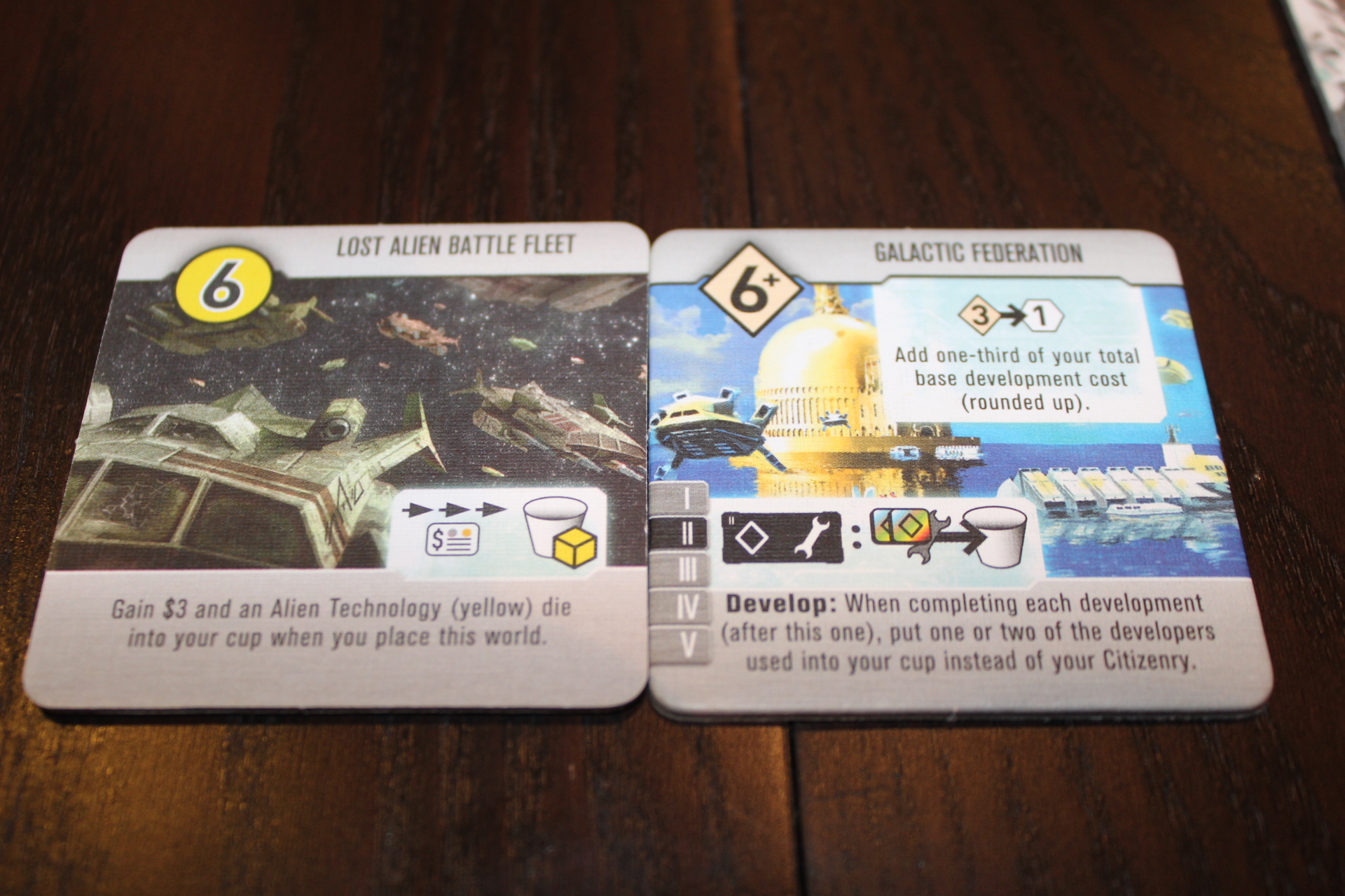 For instance, the Galactic Federation development gives you one third of your total base development cost (don’t count bonuses from other 6+ developments) back as extra VP. That’s pretty awesome. It also has a pretty sweet ability, but that’s just an added bonus.
