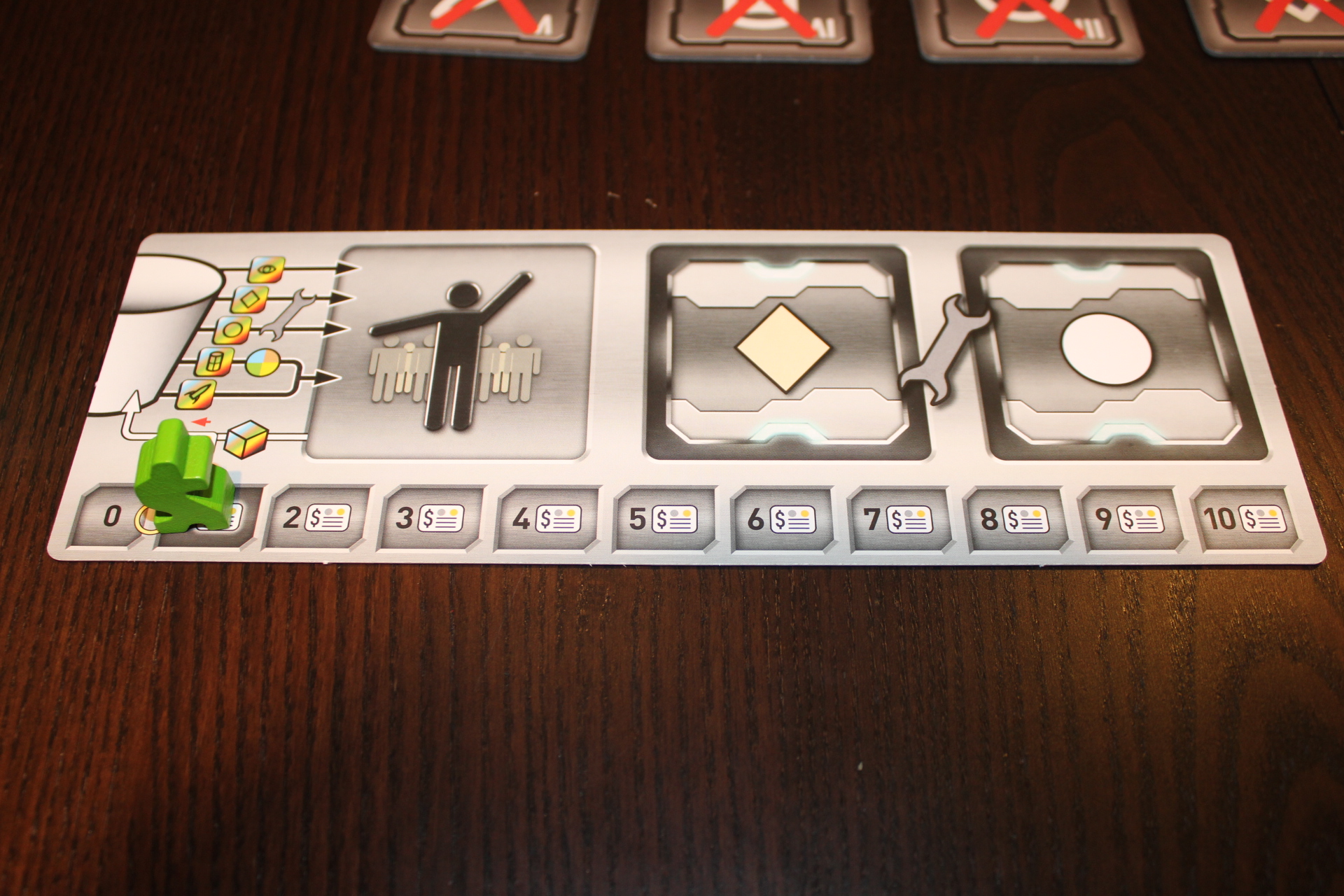 Give all players a phase strip. This one nestles pretty nicely in front of the screen, and is used to help organize your “workers” (the dice you roll on your turn). I’ll get to that later.