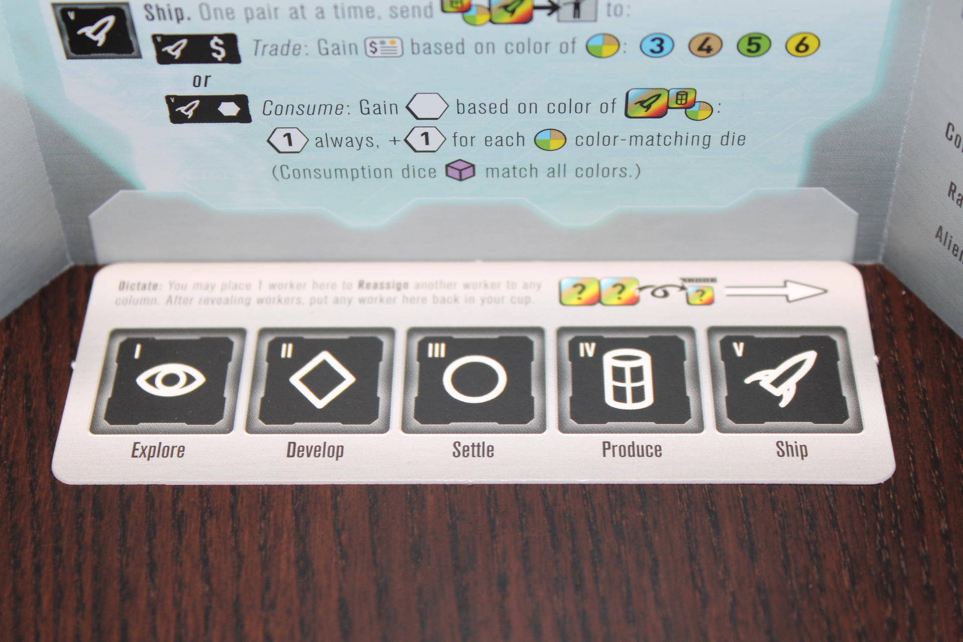 So, let’s say you needed four developers but only rolled two developers, two ships, a settler, and a produce. This is a bummer, but you can still get three if you use a ship to force the Develop Phase. You’re one short! However, some tiles include a Reassign power that allows you to reassign dice to other phases, once per turn. This is an excellent way to hedge the normally-problematic luck element that comes with most dice games. And, even more fortuitously, every player starts with one Reassign power: Dictate! This power allows you to set aside one die (in the above example, the white (Home) ship, and then place another die in any other phase (which is how I moved the Produce die to Develop). While it’s incredibly useful, you can only use it once per turn, which is a bit sad if your roll really sucks.