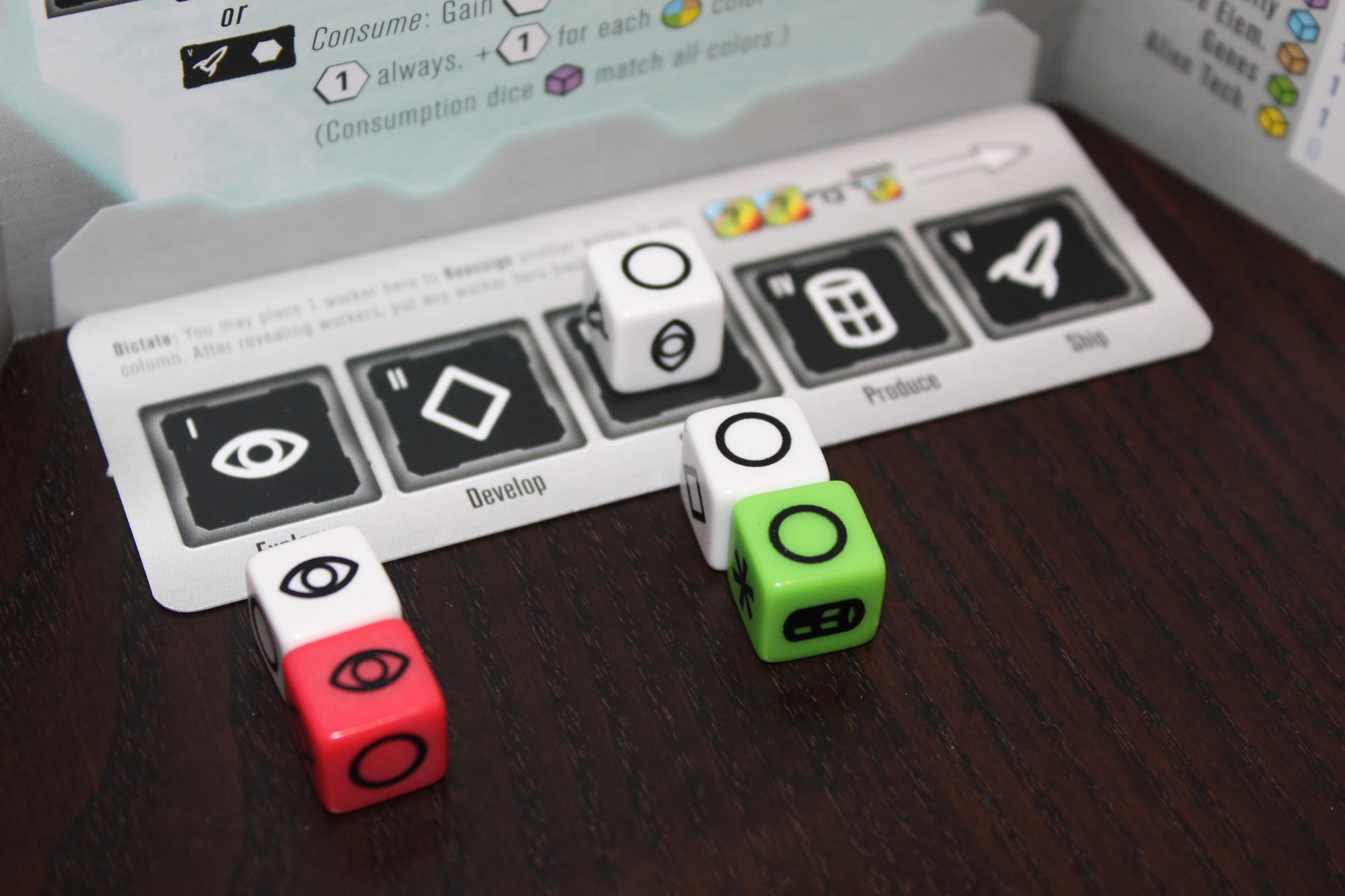 - Consume. This one is fun. The colors of the dice do matter. Follow these steps exactly: