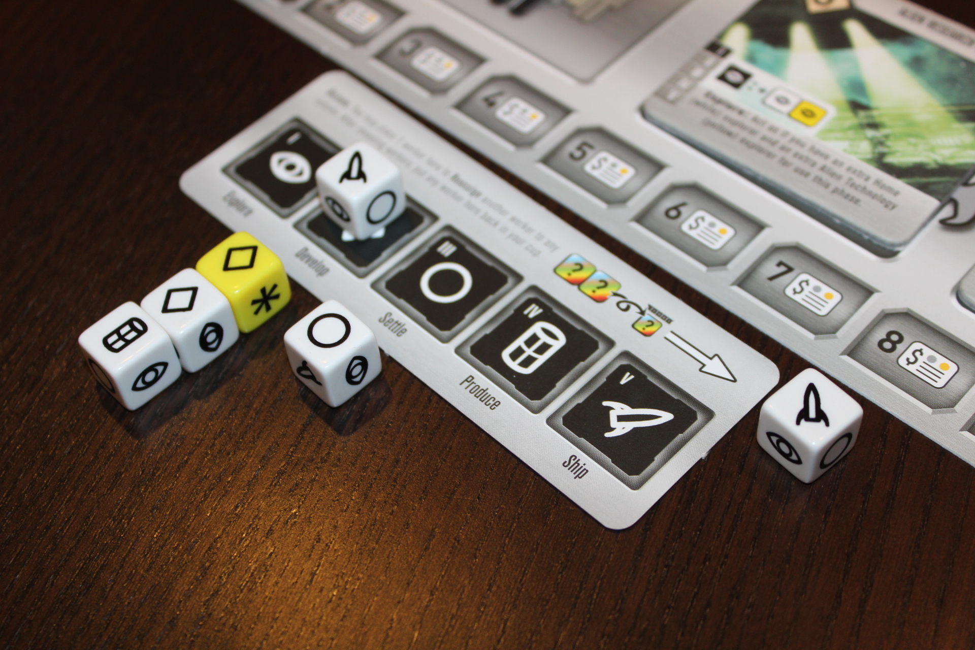 See how one of the ships is on the develop phase icon? That means it’ll count as a developer when the Develop Phase happens. That’s pretty sweet. Now, you might be asking yourself what the other ship is doing, and why I have a Produce die under develop. That’s a great question and I’ll answer it shortly.