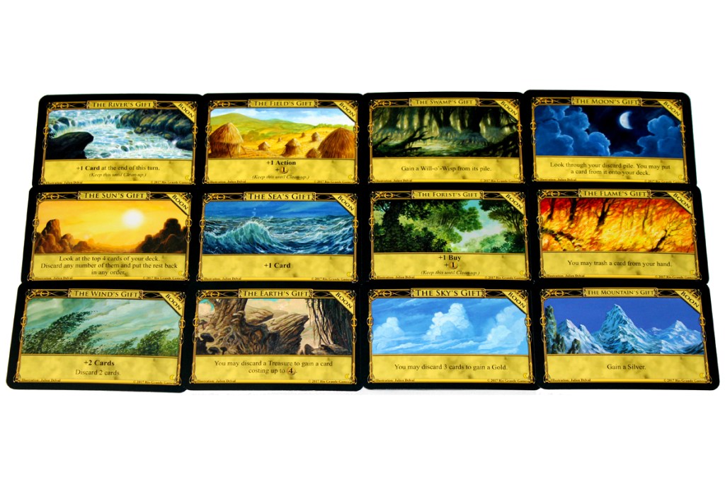 Certain cards make reference to one of three Spirits: the Imp, the Will-o-Wisp, or the Ghost. I honestly just put them all in play anyways because a Boon references them. Set them nearby; they’re not in the Supply.