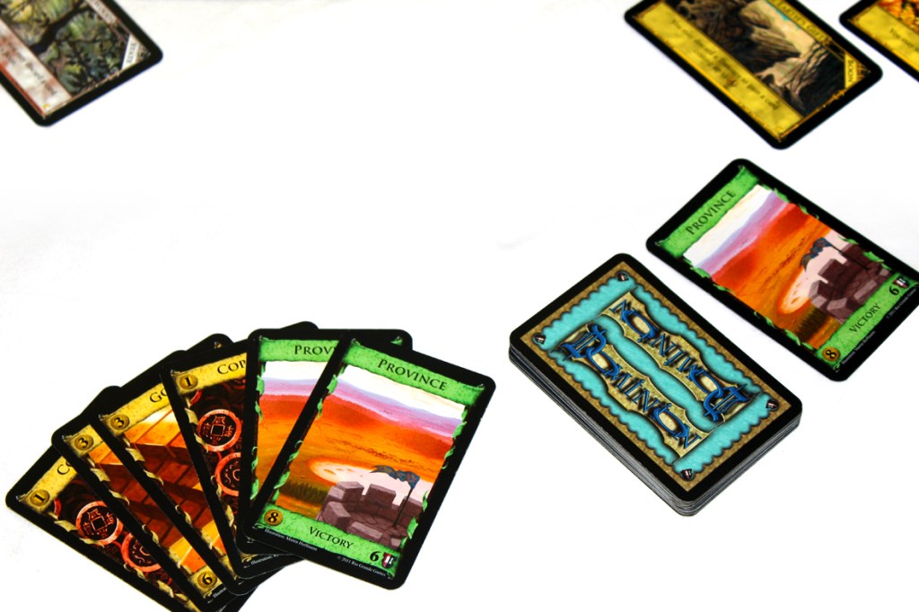 - If you tend to play fast and loose with the exact rules of Dominion, this may trip you up a bit. The thing I usually mess up is when cards are “in play” versus in your discard pile, and unfortunately for me, there are a bunch of cards that use the mechanic of relying on cards that are still in play. Make sure that you keep track of where cards are!