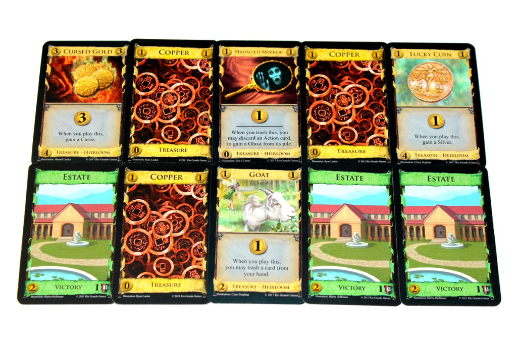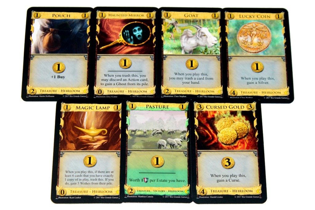 - One of my favorite things about Dark Ages was them mixing up the starting cards to be a bit different, and I love Heirlooms, as a result. Anything that changes the starting deck is almost always going to be something that I like; I’m just happy to have a bit more variety. I like that the cards generally synergize (or anti-synergize, in the case of Pooka + Cursed Gold) with at least one Kingdom Card, too. I’m just all around a fan.