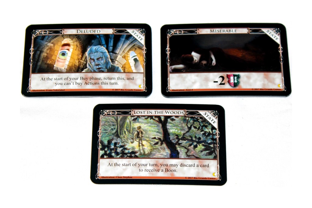 Certain cards will cause you to gain a State, which may be anything from Lost in the Woods to Deluded to Envious to Miserable, which is the full state of Allowed 2020 Emotions. So you’ve got that going for you, which is nice. If that happens, take the corresponding State card and place it in front of you until told to do otherwise.