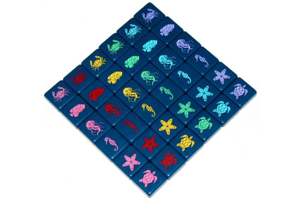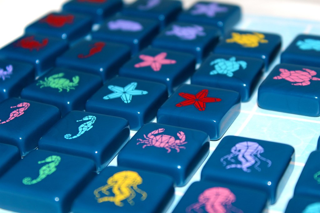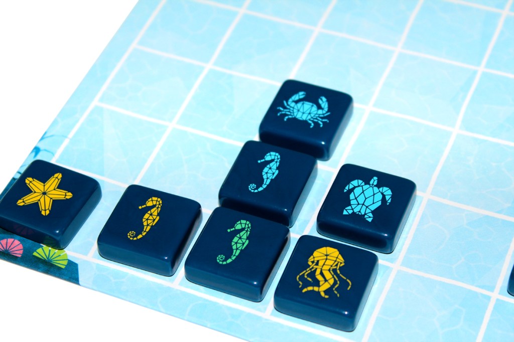 The gameplay is pretty simple, as well. Your goal is to form schools, or orthogonally (non-diagonally) adjacent sea creatures. One player’s goal is schools of different animals of the same color, and the other player’s goal is schools of the same animal.