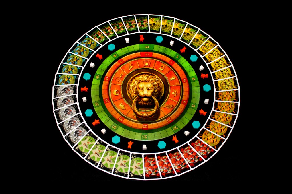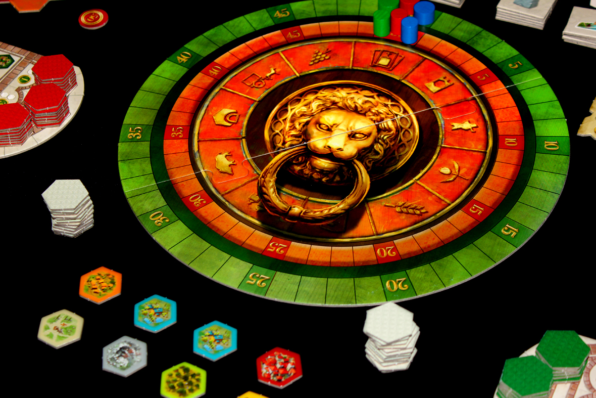 Again, add your green points to your red points, and that will determine your score. If you have any Region Cards left in your hand, gain 1 red point for every 3 Region Cards you have. If you have extra unplayed tiles / marble / workers, gain 1 red point for each token you still have.