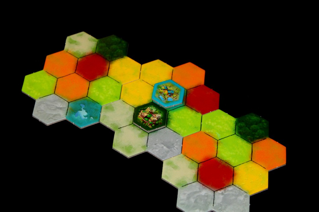 - Blue: Gain a blue wild hexagon to your tile storage area. As a subsequent action, you may treat this hexagon as a tile of any color and play it to a space of your choice (following normal placement rules for a tile of that color). If you play it to a light green tile, it’s considered its own type of agriculture. If, for some reason, you gain a blue hexagon and your tile storage is full, you immediately gain two red points.