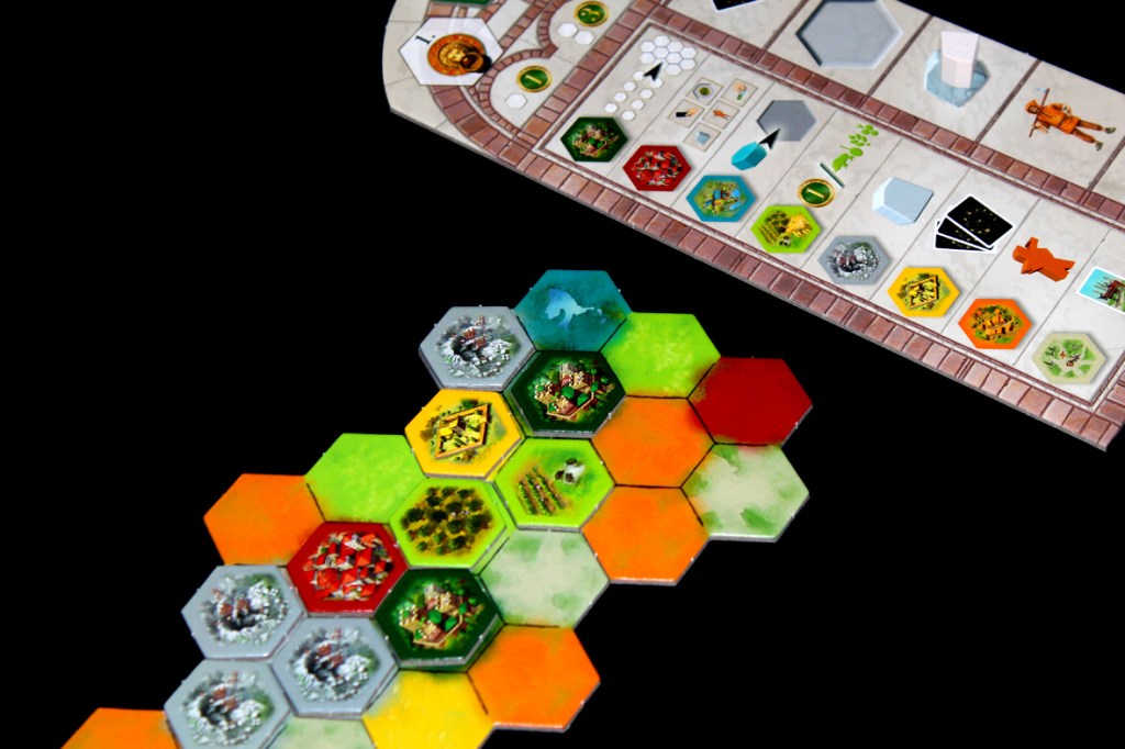 Finally, you can shuffle the 32 beige hexes and put them into some small stacks near the scoreboard (don’t reveal them, yet).