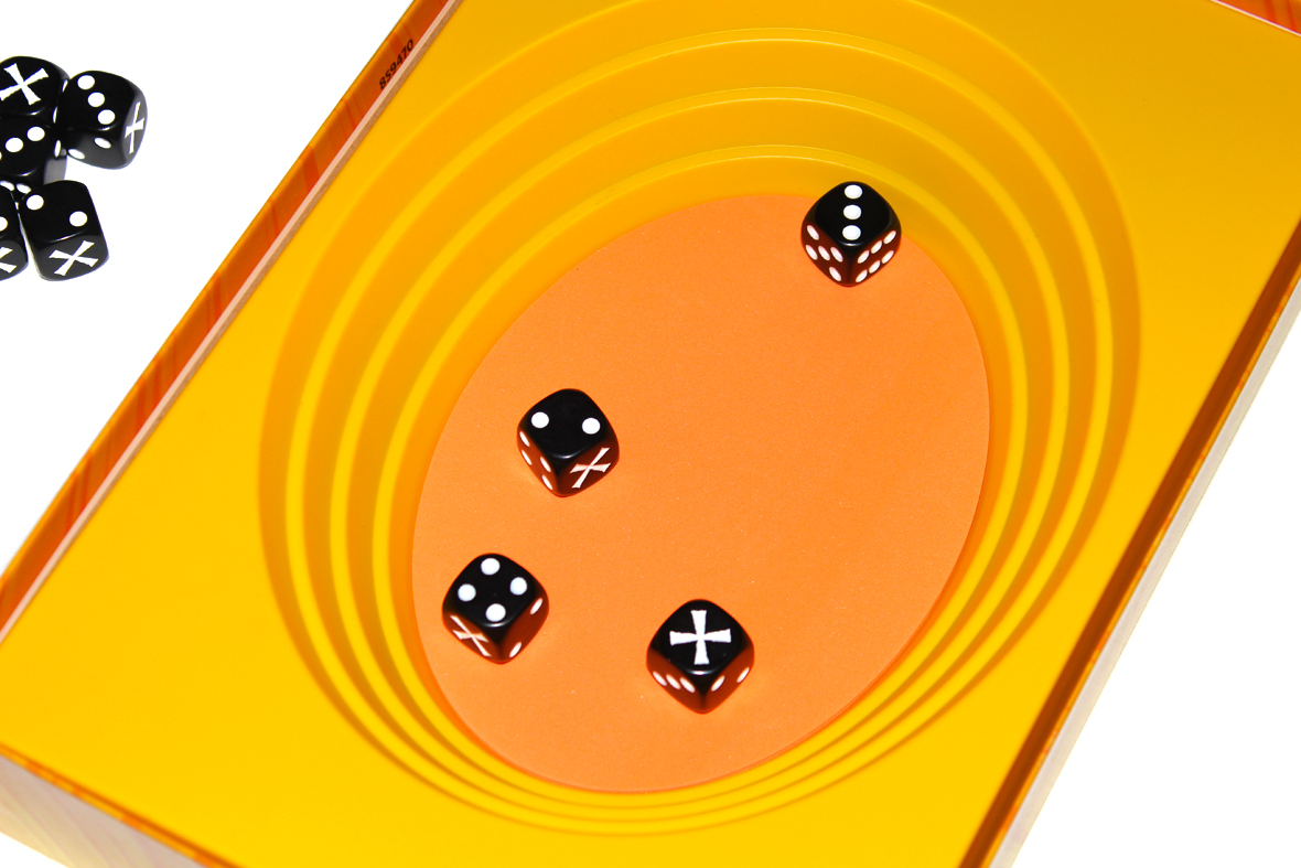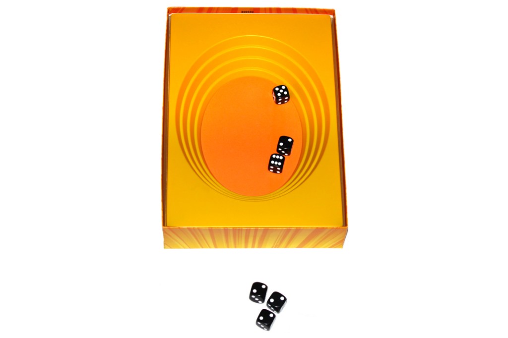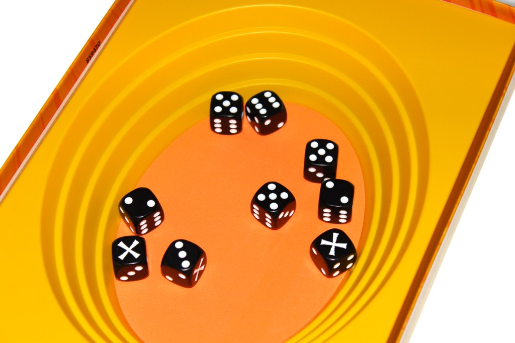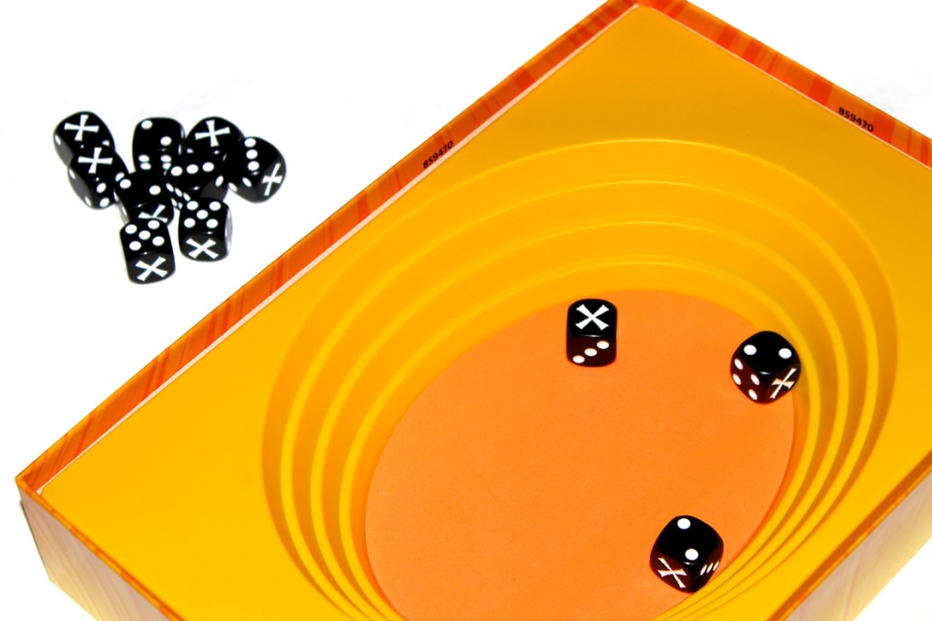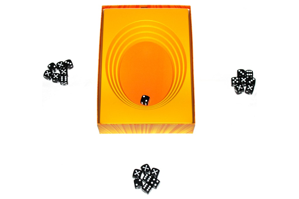 Note that there are no limits to how you throw your dice into the center; you can toss them, lightly roll them in, pitch them, whatever! Just, if any of your dice bounce out of the center, they’re also removed from the game, so be gentle.