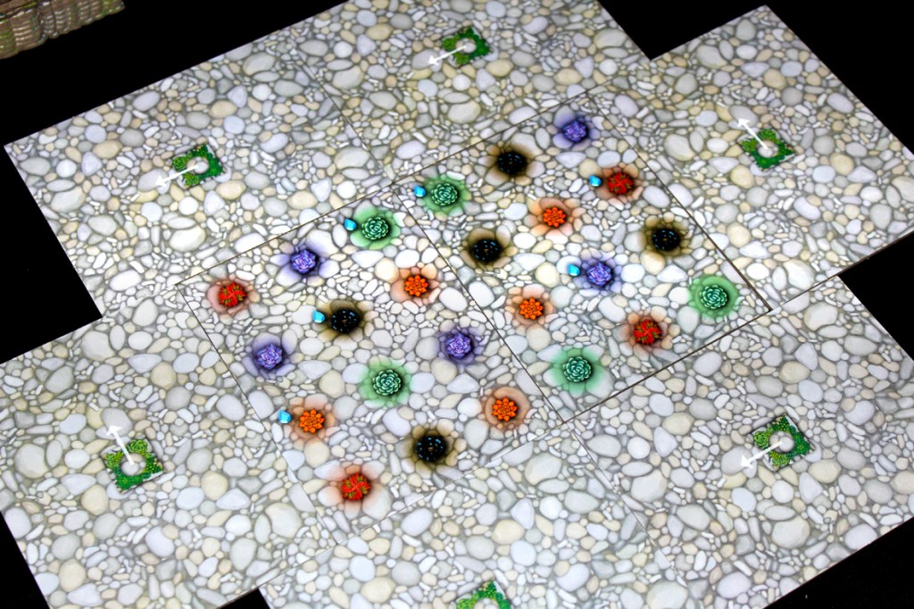 - The components really give the game an impressive table presence. Whoever decided that the flower beds should have space for player flowers so that the game gets this three-tiered texture knew exactly what they were doing. It looks really good on the table, and it’s got the right color scheme (that green contrasting with the gray, and the flower colors on top of of that) to catch someone’s eye. Naturally, there haven’t really been conventions to show it off, but I could see it getting some traffic on component quality and art alone. It helps that it’s fun, too.