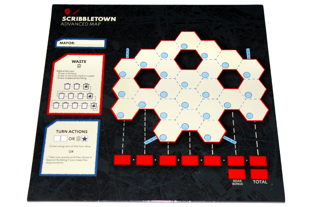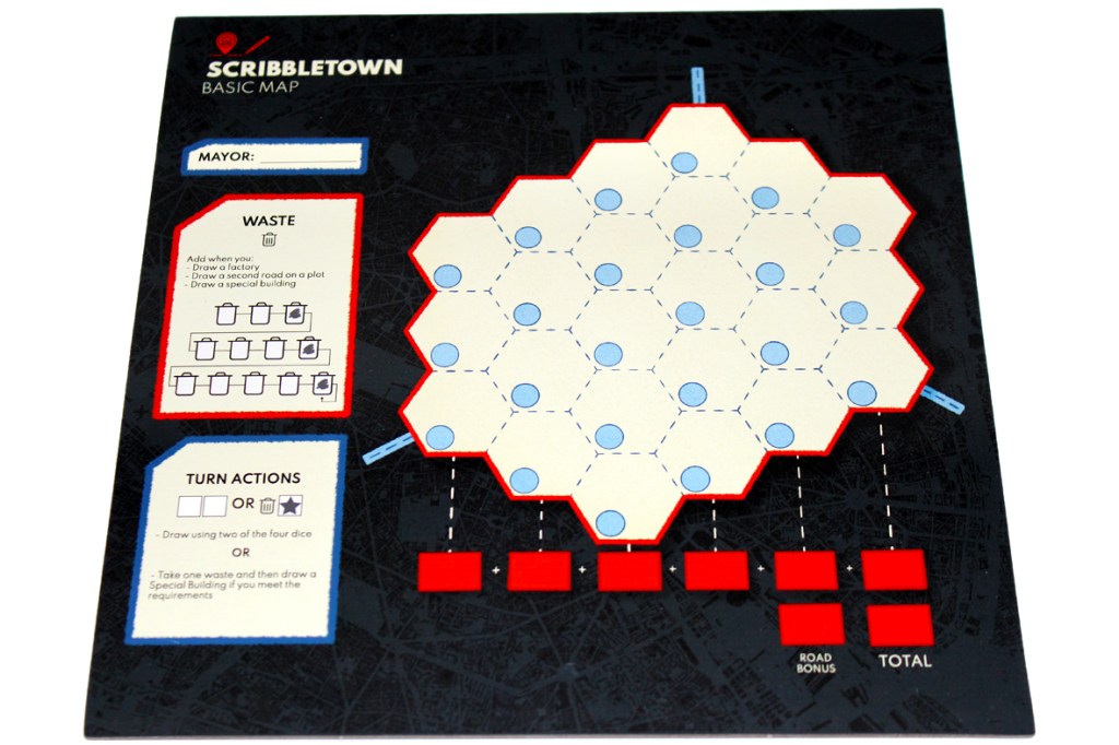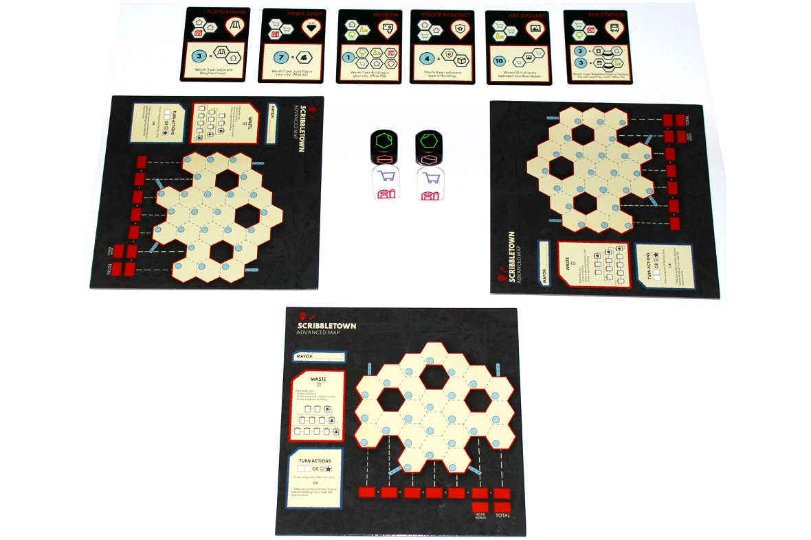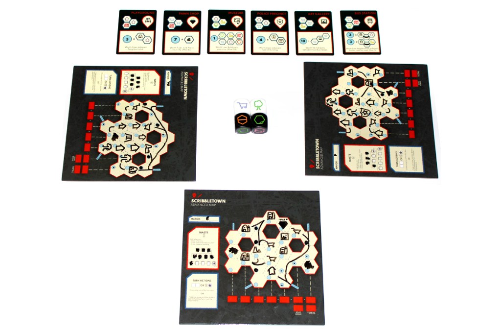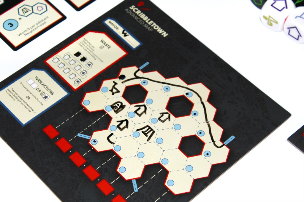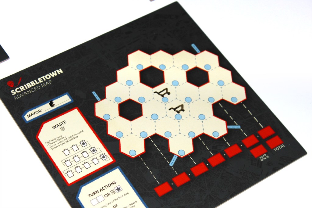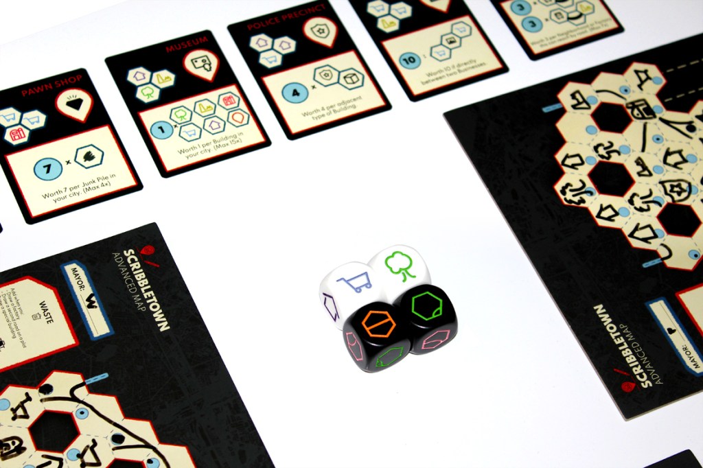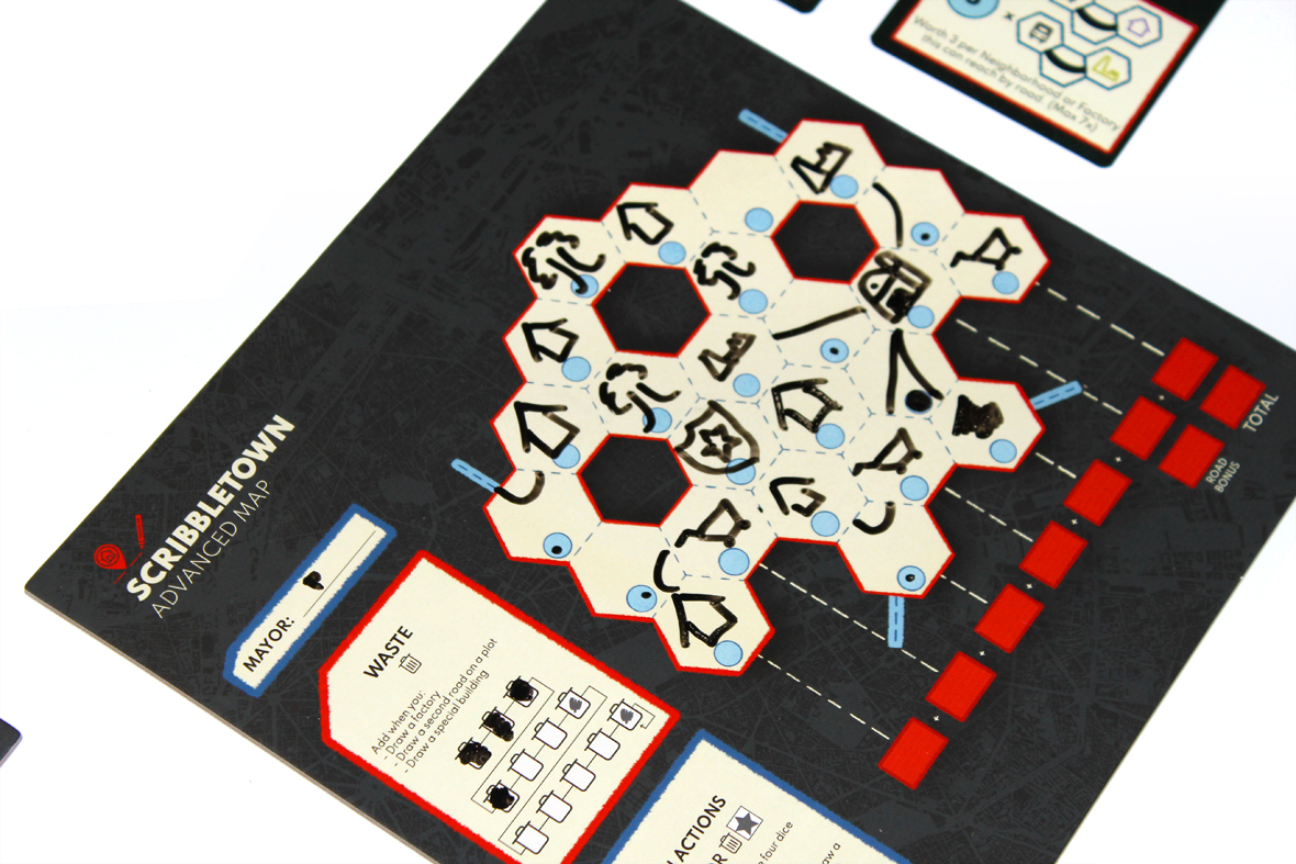 A game of Scribbletown is played over several rounds, as players add roads and buildings to town. Too much overuse, however, produces waste, which leads to junk spaces that can’t be used any anyone. You’ll have to balance all that if you want to win!