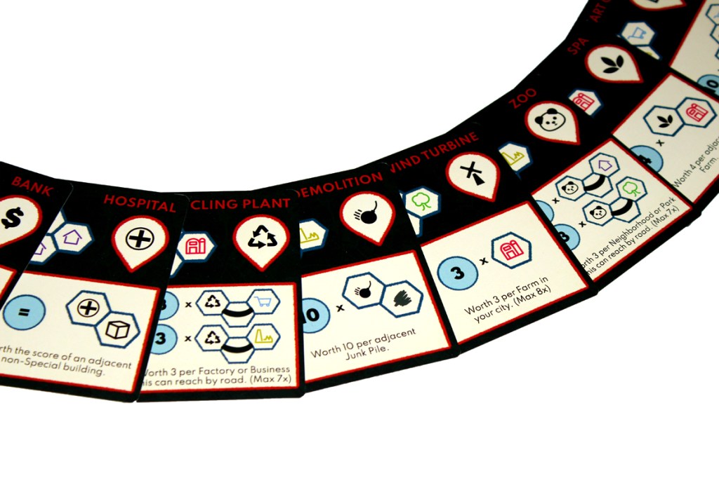 Special Buildings have specific requirements in that three buildings must all be constructed adjacent to each other (their hexes should all meet at the same point). You then may, instead of constructing normally, take a waste and add the Special Building anywhere on your board. As you might guess, you can only have one of each type of Special Building in your city, but you can have one of each if you can hack it, I guess. Good luck with that. They have special scoring bonuses, too!