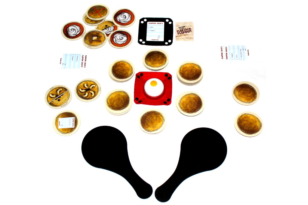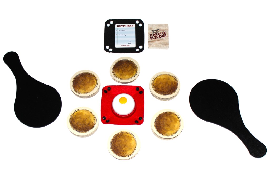 - Make sure you’re not playing this in tight quarters, or someone’s gonna get clocked. Players are not going to be safely flipping flapjacks in their first few forays into this game, and I worry someone’s going to get their noggin bonked. Having a decently-sized space to play the game is probably safest, or letting players do some practice flips.