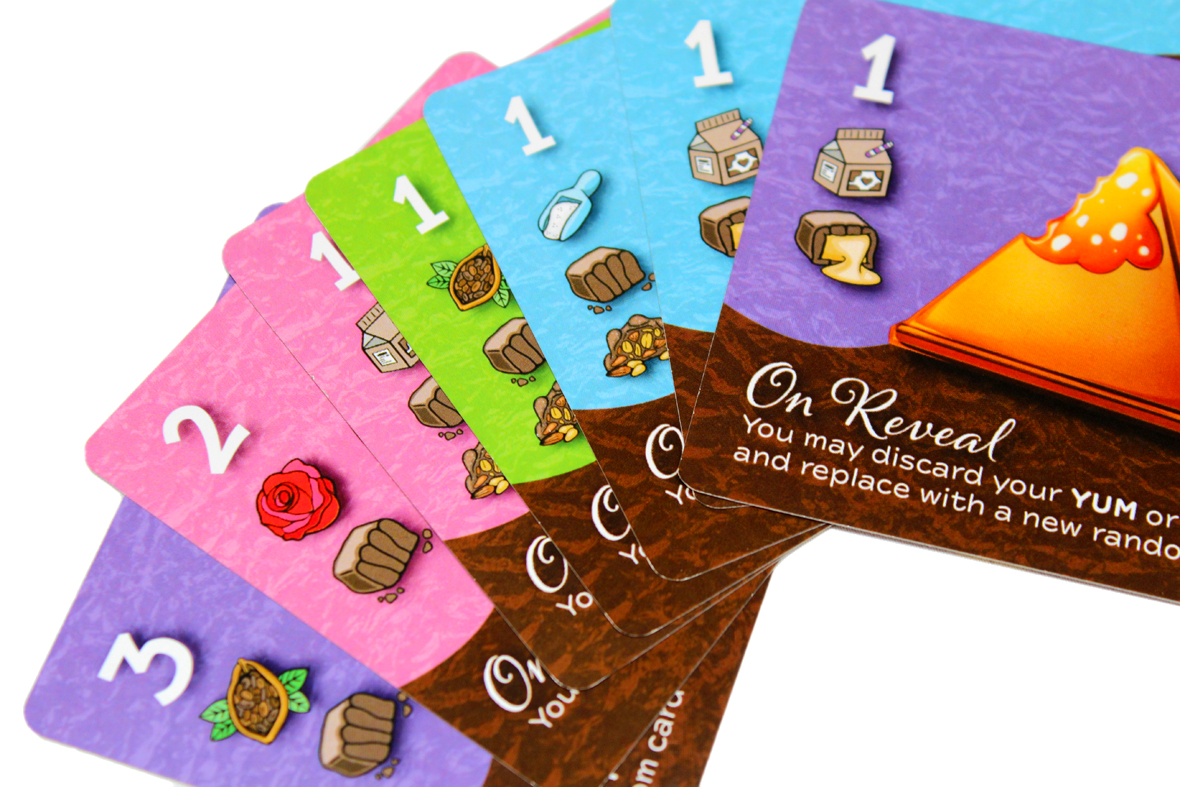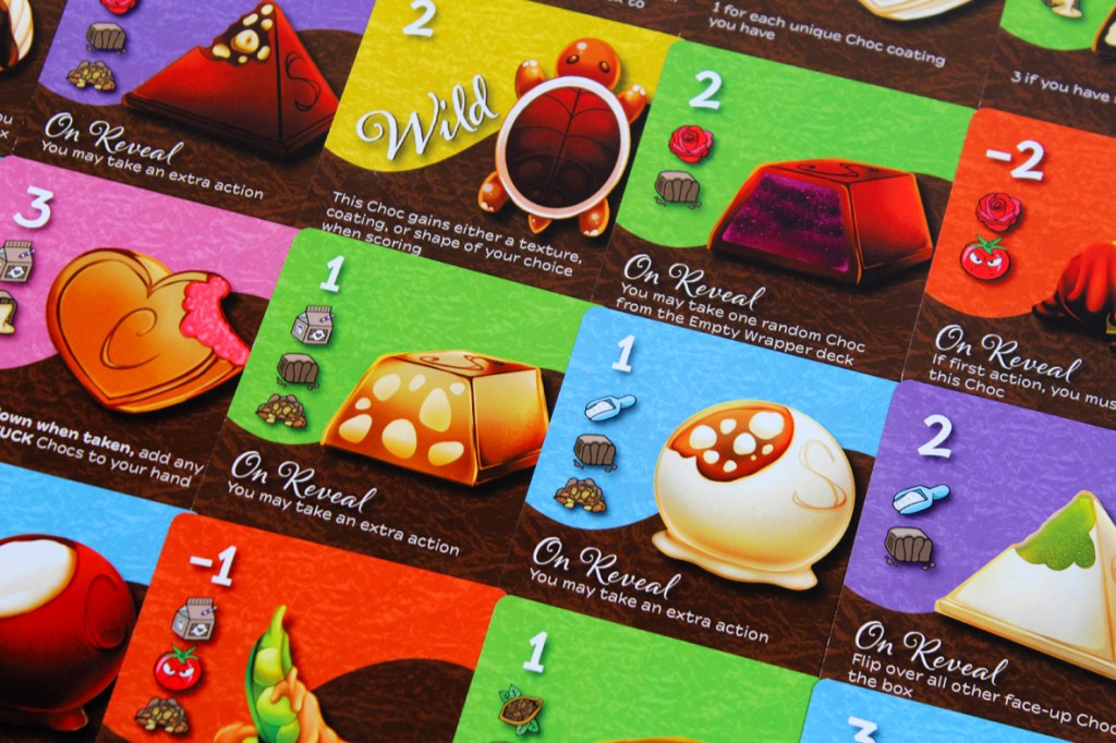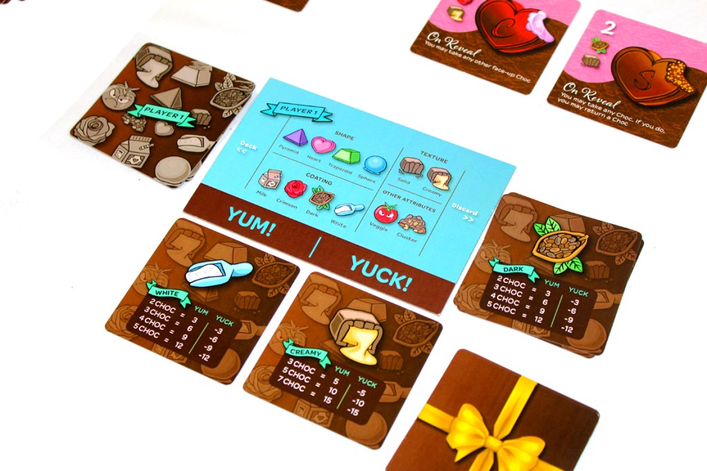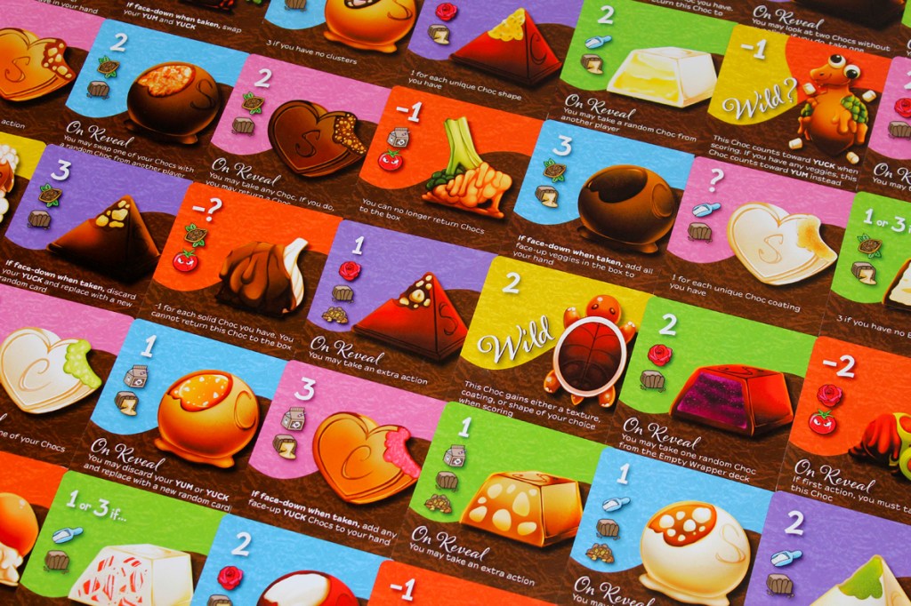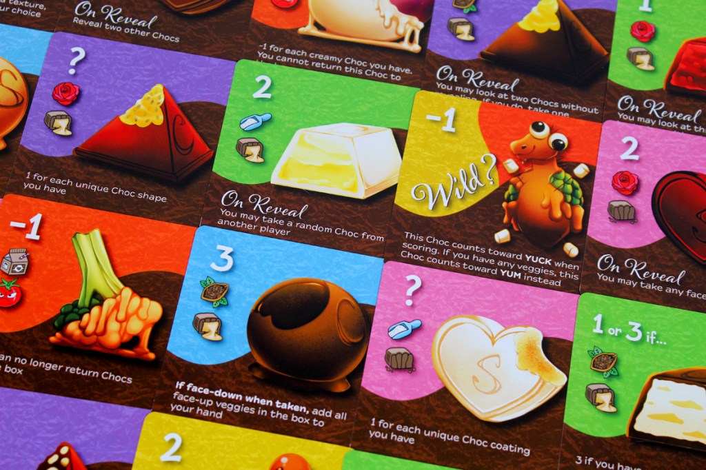 - Naturally, prioritize skipping your “Yuck” chocolates and getting your “Yum” chocolates. This can be challenging if another player has similar preferences to you, at least in the “Yum” space. If you and another player have similar “Yuck” chocolates, then you’ll just notice that a lot of chocolates are ending up revealed in the center of the box. This isn’t to say you should take 0 “Yuck” chocolates, either! Sometimes they overlap with your “Yum” chocolates and, depending on your “Yuck”, you may be able to take a couple without penalty. Either way, the “Yum” points really ramp up if you get enough of them, so it may be worth grabbing a few or searching for Wilds.