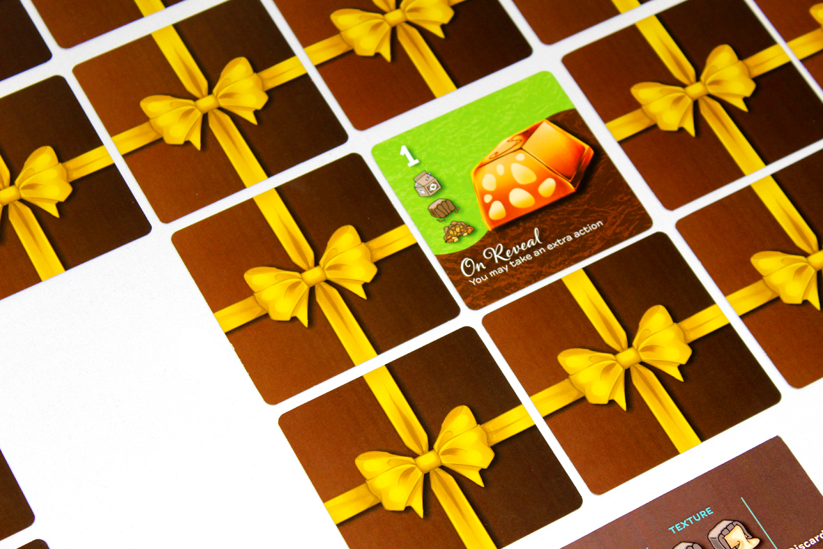 This one’s pretty simple. Take any chocolate (face-up or face-down) in the box (the play area) and add it to your hand. Your hand is private; nobody can look at it.