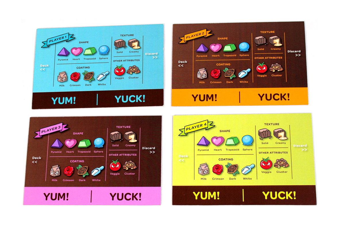 You can place the other chocolates nearby, face-down: They’ll be Empty Wrappers for this game. Each player then draws two of their Yuck / Yum cards, and chooses one to be their Yuck and the other to be their Yum. Keep those face-down: