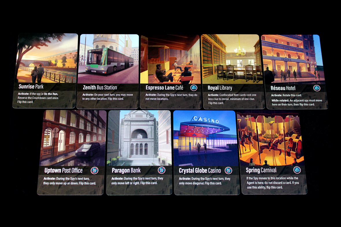 - Activate Location Ability: 8 of the 9 Locations in play have an ability that you may be able to use. Generally, some are a bit more complicated, others restrict the Spy’s movement, and others still can provide benefits for you. Once you’ve used a Location’s ability, you will generally flip it over.
