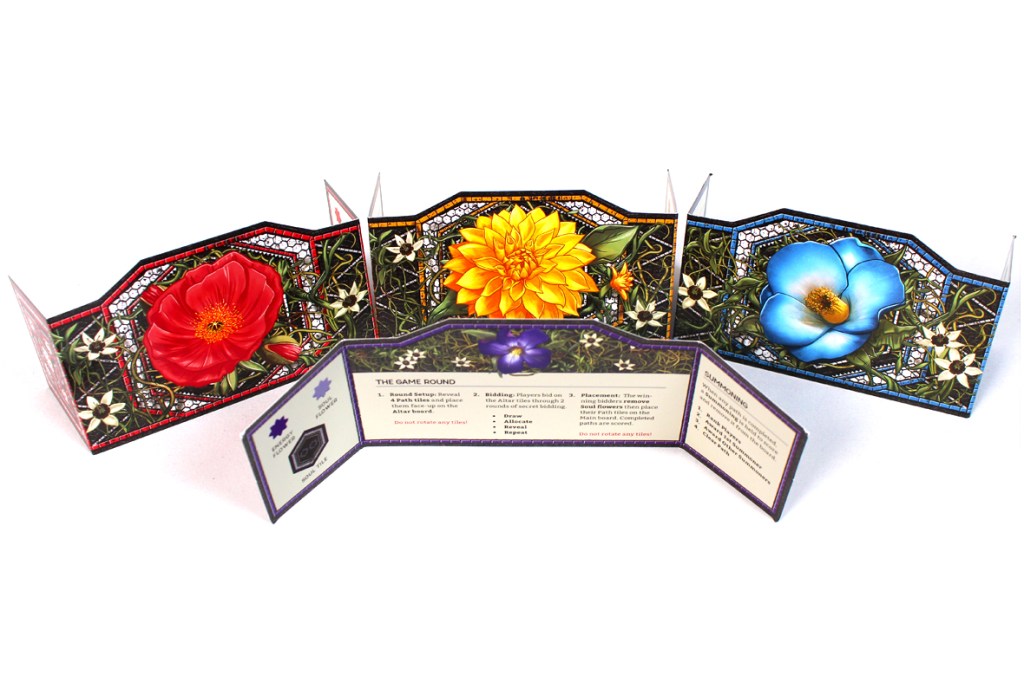 Once every player is ready, reveal, and place the flowers on your bid board on the tiles on the Altar Board. Once every player has done this, repeat the auction one more time (secretly) so that every player ultimately has placed six flowers.