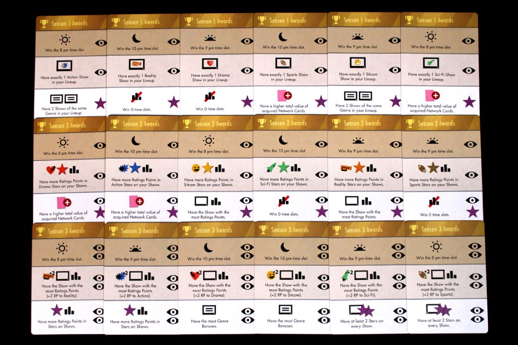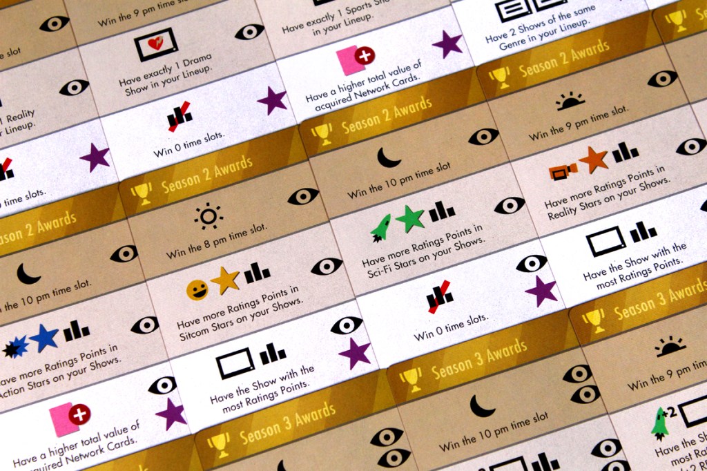 - Keep an eye on the awards and plan ahead, as best as you can. As I said, sometimes this is buying Network Cards. Other times it’s locking down time slots. I had a really weird one in my last game (photographed here) where every Award wanted to lock down the 8PM time slot, which was amusing. As a result, players were incentivized to consistently build up their 8PM show and maintain that so that they could control that zone for additional Viewers.