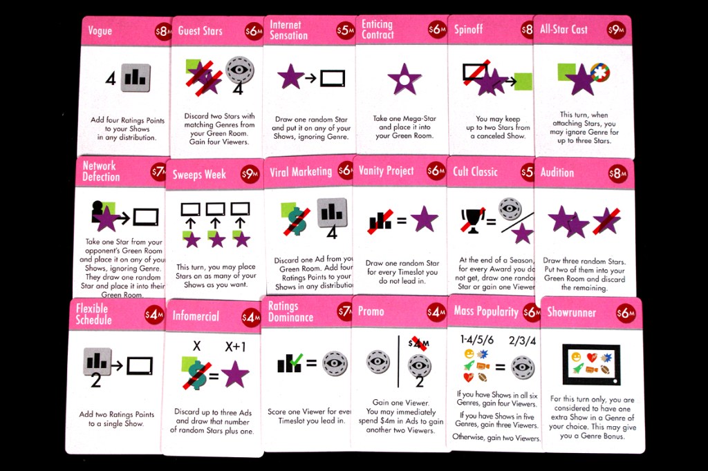 - Getting a bunch of stars can be useful, but you need to have the right shows for them or the Network Cards to work around them. Sitcoms tend to work well for getting many stars into your Network as possible (that’s their Genre Bonus, two free Stars). That said, going deep on a limited number of shows means that you can very likely end up with Stars who cannot be placed on any of your Shows. Thankfully, there are a few Network Cards that will allow you to ignore Genre on Stars, meaning there’s always a backup plan. Going deep on Stars is good for your Ratings (and consequently good for Ads), but you should try to make sure there’s an alignment there, if possible.