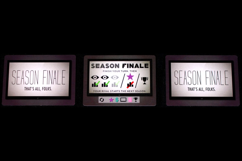 After your turn ends, the Season Finale is scored! First, the player leading in more time slots scores a Viewer for each time slot they lead in; the other player gains 1 Star from the top of the Star Deck. In the event of a tie, nobody gets anything.