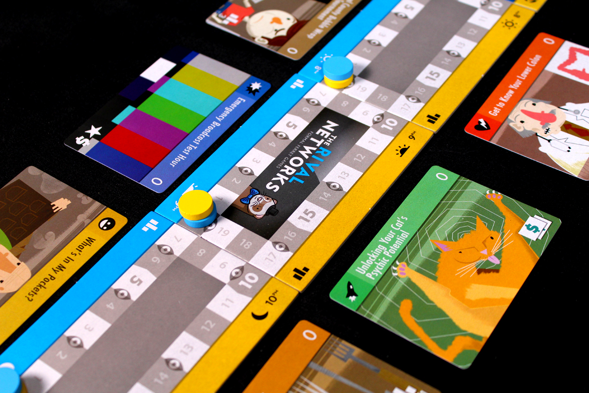 Overall, I like The Rival Networks quite a bit! I think, for me, the game really starts with its theme. It’s got jokes and bright, colorful art, and Rival Networks lets you know from the start that while you’re going to have some strategy and some conflict, you’re mostly here to have fun. It’s a pleasant tone for a game to take, and I think it works well for the position it seems to occupy, gently lampooning TV and TV networks. Beyond that, though, there’s a good amount of interesting strategy, to this one. I remember the original Networks (though it was a while ago, my last play), and this is definitely a streamlined and simplified version of that. But it works with two players! I think a lot of two-player games similar to The Rival Networks all kind of have a tug-of-war mechanism that I find gently annoying, but here, it’s deemphasized. You have a tug-of-war, still, for control of the three time slots, and winning that is good, but it’s not the be-all / end-all. It’s a gentle incentive, and I appreciate that. I was actually surprised by the Rival Networks’s simplicity. I expected it to be a little bit weightier or complex than it actually is. To me, that’s good! It means that once you get experienced with this, you may be able to loop a full game in 30 minutes or so. Means it’s also pretty easy to get in for a rematch, which is kind of ideal with these two-player games. Sure, there are shorter ones, but if you’re looking for something on the weightier end of fast, Rival Networks might be more your speed. This also helps balance out some of the random elements that can potentially frustrate, as you can just play another game if you felt you were disadvantaged by card draws during the first one. You should try to make your own luck, but there are ways that you may run afoul of certain random combinations. That’s randomness, sometimes. An included insert would have been nice, and I do get confused by some of the iconography, but those are fairly small issues in a game I’ve otherwise quite enjoyed. If you’re looking for a fun romp through the ups and downs of TV network management, a cute game with great art, or a solid two-player title, I think The Rival Networks might be right up your alley! I’ve certainly enjoyed it.