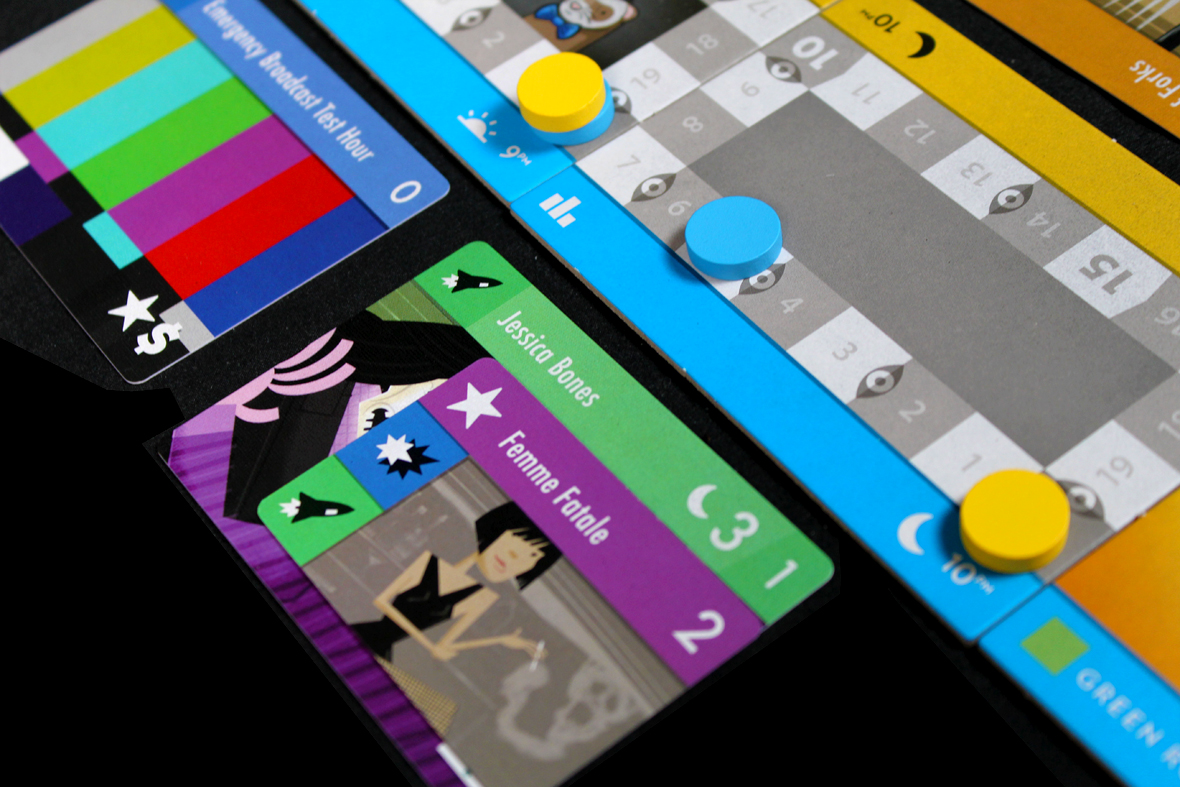 - Keep an eye on the awards and plan ahead, as best as you can. As I said, sometimes this is buying Network Cards. Other times it’s locking down time slots. I had a really weird one in my last game (photographed here) where every Award wanted to lock down the 8PM time slot, which was amusing. As a result, players were incentivized to consistently build up their 8PM show and maintain that so that they could control that zone for additional Viewers.