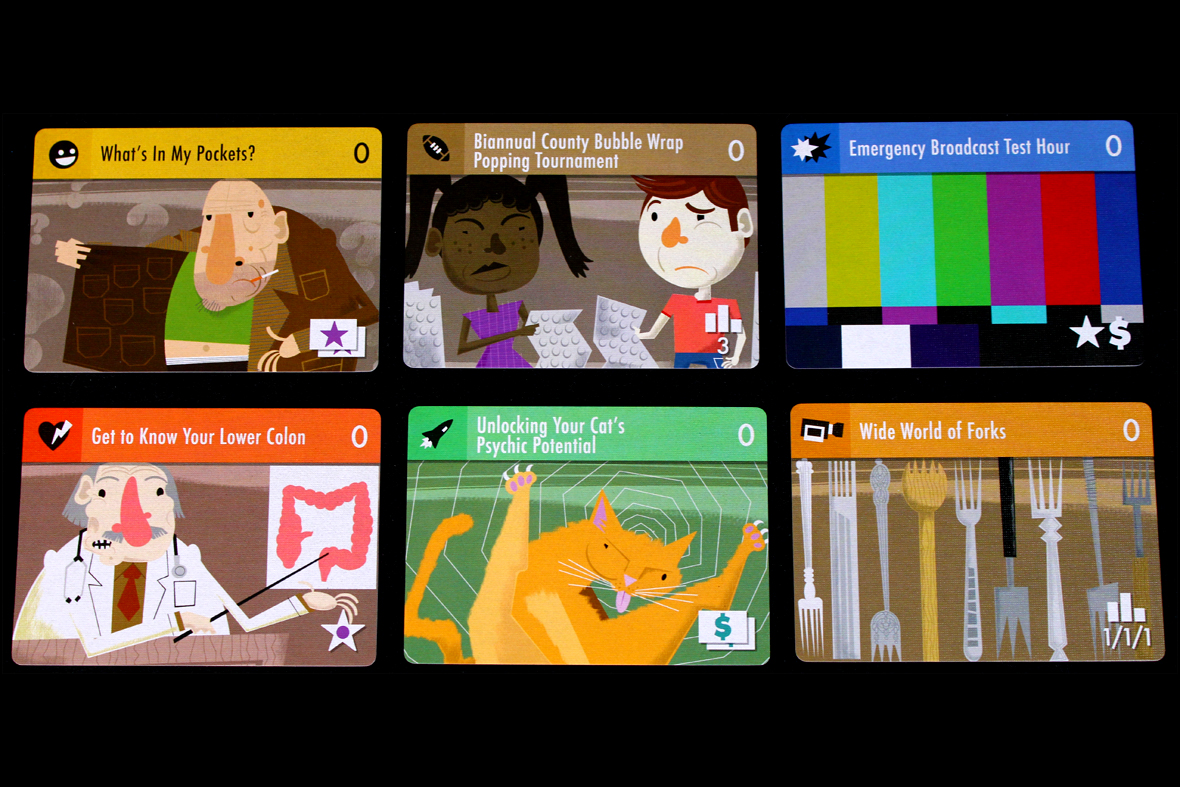 If the Ad deck runs out, shuffle the discard pile to create a new deck. If the Star Deck runs out, check the discard pile; if there are fewer than 10 Stars discarded, players must both simultaneously discard a Star from one of their current shows until there are at least 10 Stars in the discard pile. This won’t affect the show’s ratings, but it might affect Awards. Either way, shuffle the Star discard pile to create a new deck.