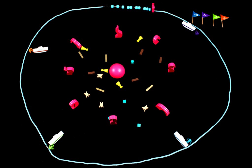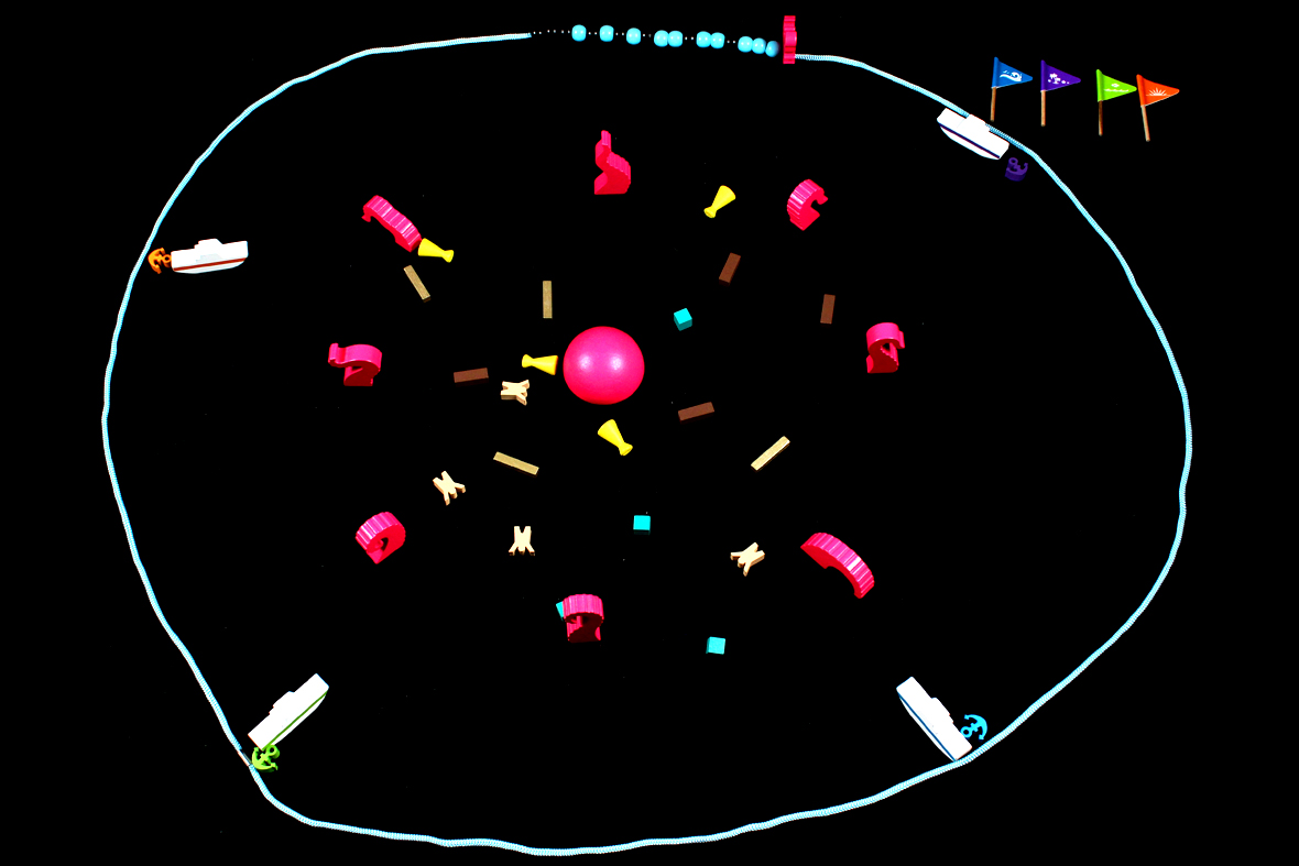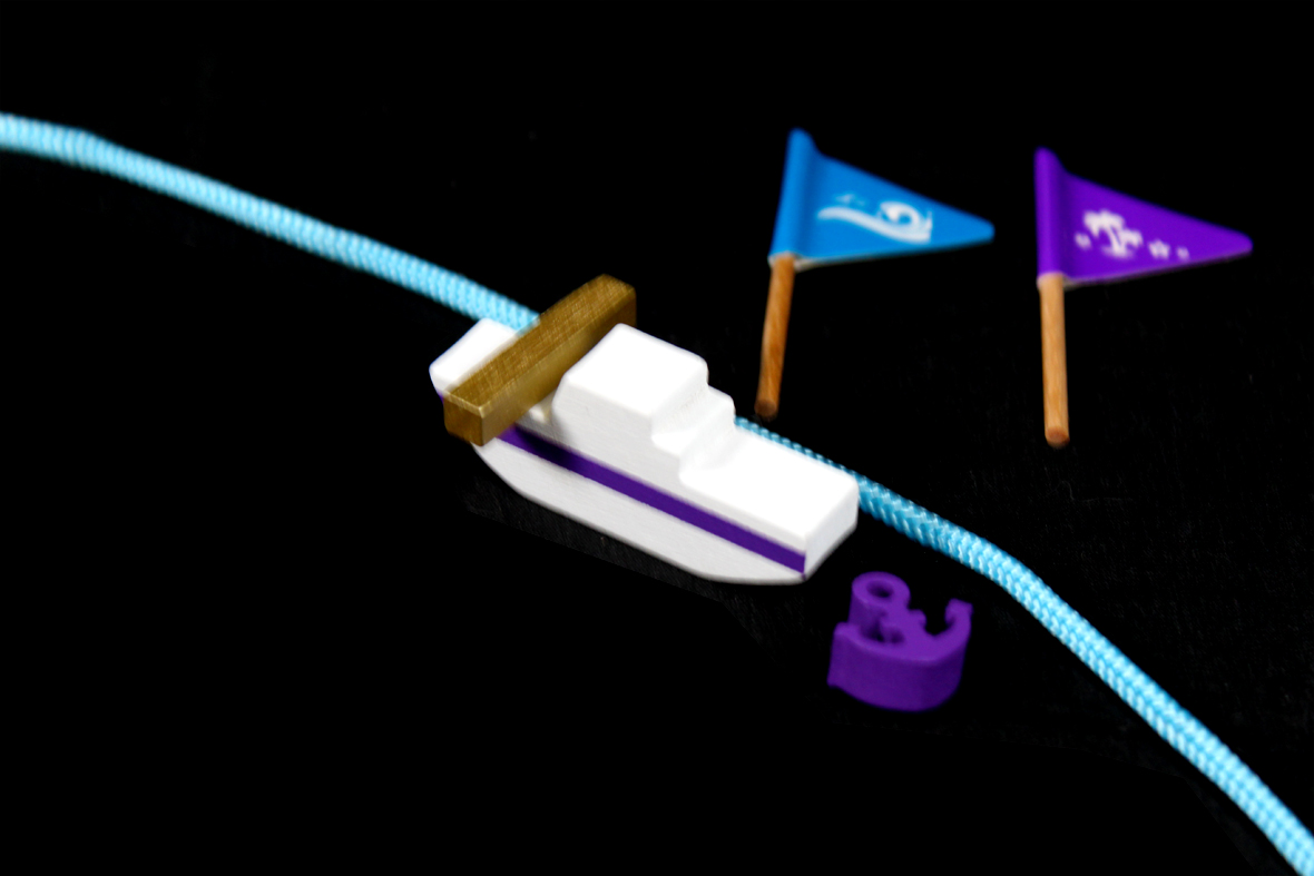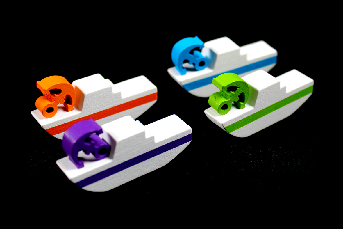 Split up the ship tokens and place them equidistant around the edge of the Ocean Area; place their anchors nearby and give players a flag in that ship’s color: