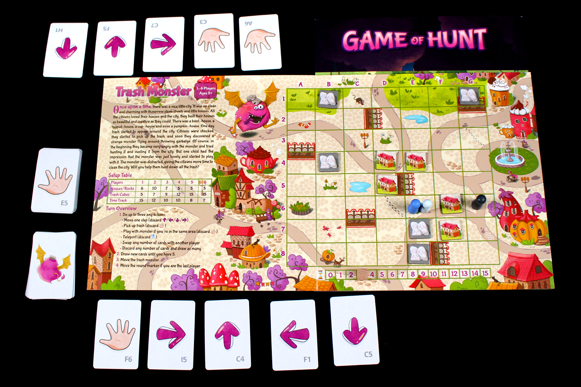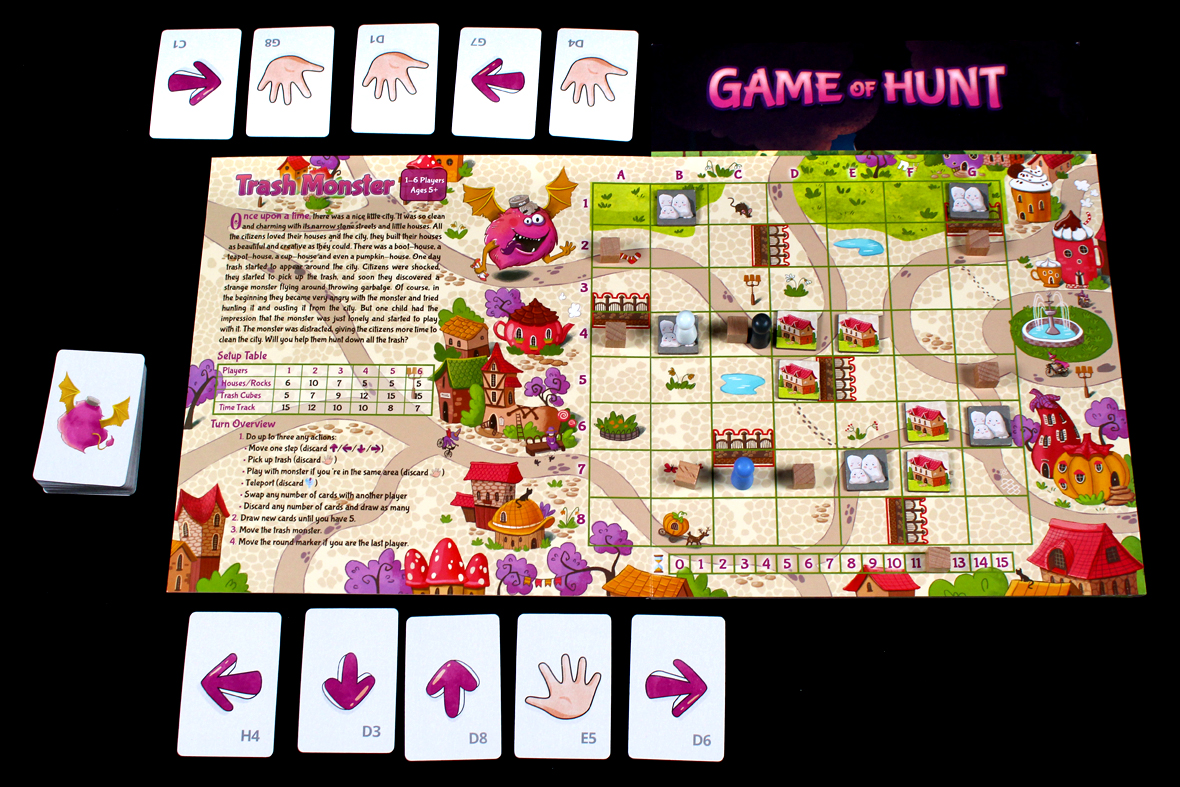 To play, players play movement cards to move around to spaces with trash cubes on them, and use the Hand cards to pick up the trash and remove it from the board. Players can also use a Hand card on the same space as the Trash Monster to play with it, forcing the Trash Monster to skip its next turn.