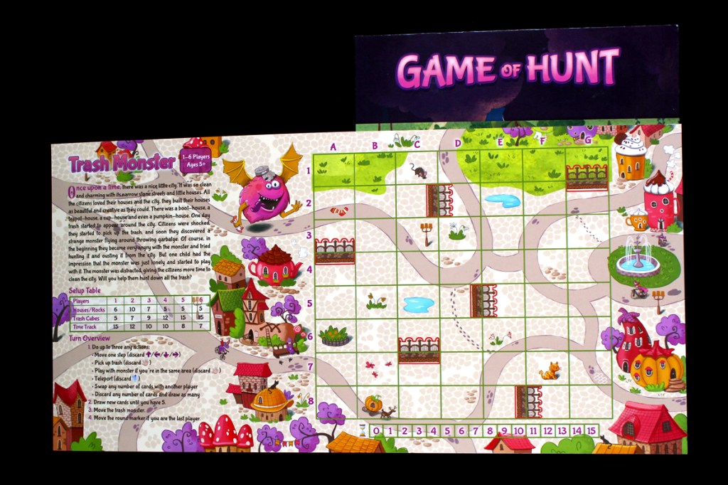 In Game of Hunt, players have four different ways to play cooperatively. They can stop a dangerous trash monster, look for some magical mushrooms, clean up another planet, or even deal with an ancient monkey temple. To help keep track of things, the board and the pieces are all magnetic. That should make the tokens harder to lose, I’d hope. Will you be able to successfully complete all four games?
