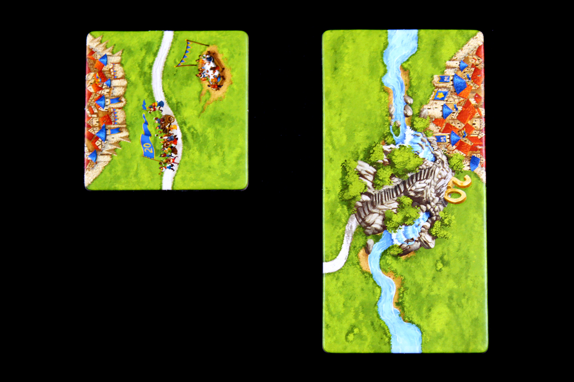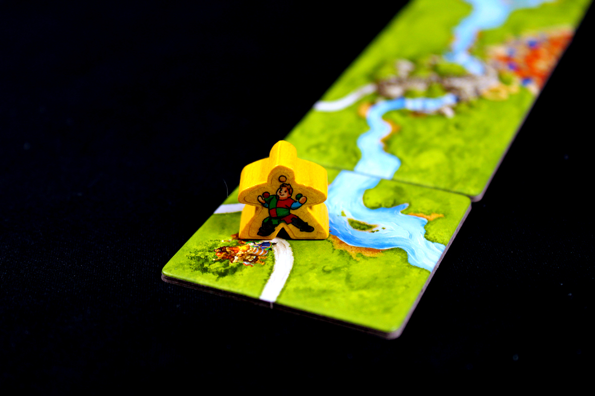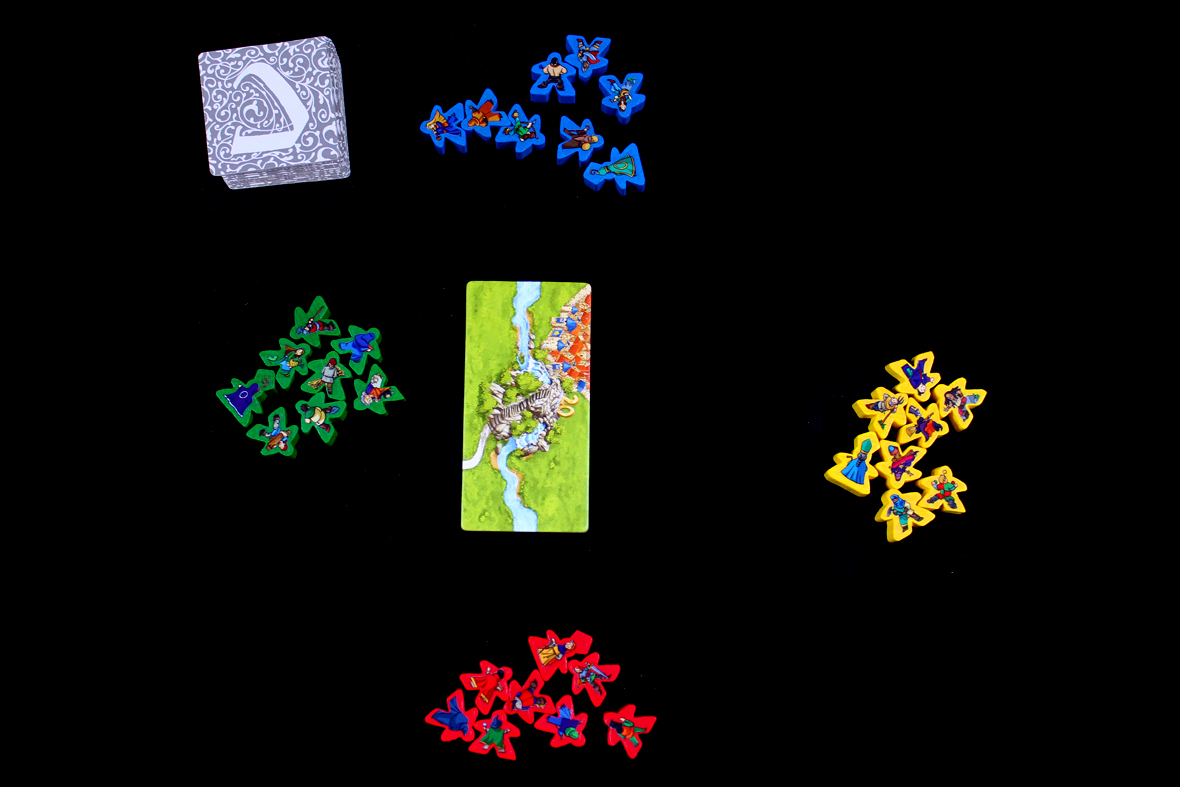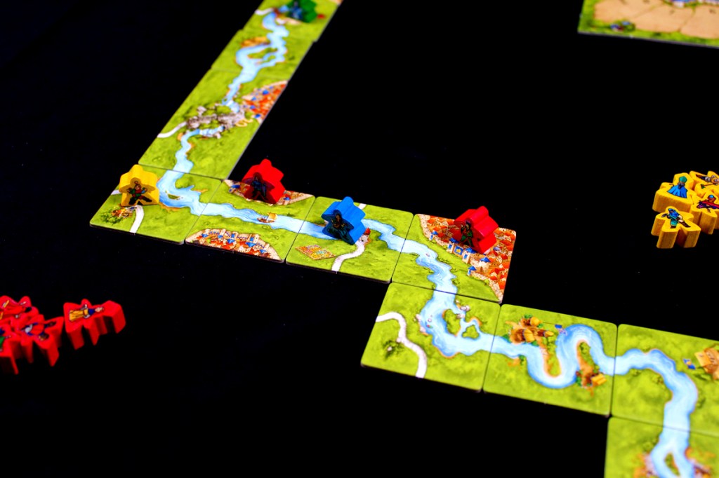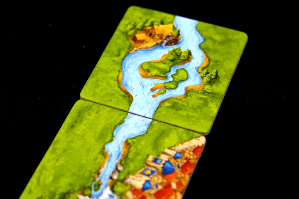 Beyond that, play normally, drawing from the River stack instead of the normal stack until all River tiles have been placed. To help, the River tiles have dark backs (as opposed to the standard light backs of other tiles), so it’s easy to distinguish which stack is which. On your turn, you may place a meeple normally on the tile if there’s a feature (meeples cannot be placed on the River itself).
