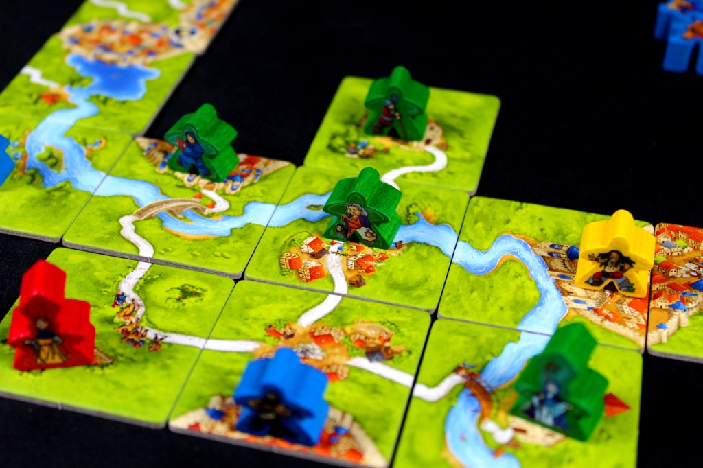 - Don’t overcommit your meeples too quickly. When explaining the rules, I tell new players that there are two mistakes I see new players make frequently. The first is spending all of their meeples too quickly, rather than growing existing features. This both spreads them too thin (making them vulnerable to getting their features stolen by or shared with other players) and it leaves them in a spot where they can’t take new features. I generally try not to go under two meeples unless it’s an emergency.