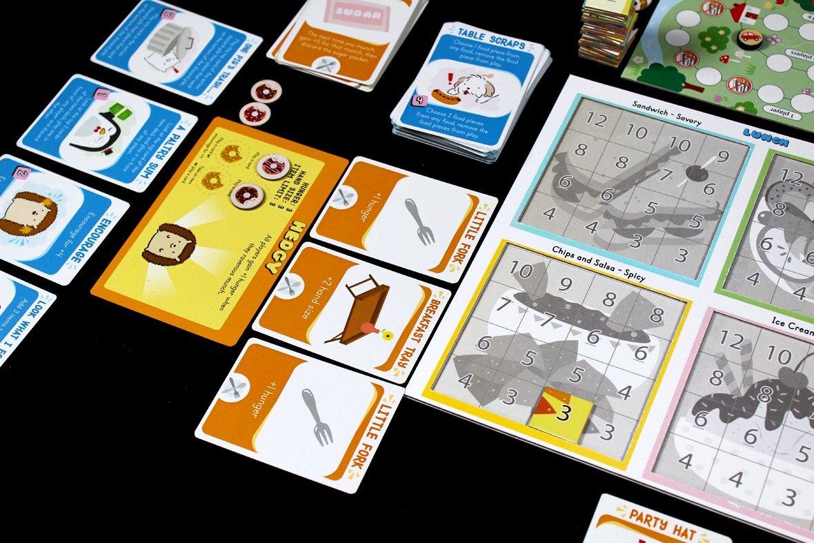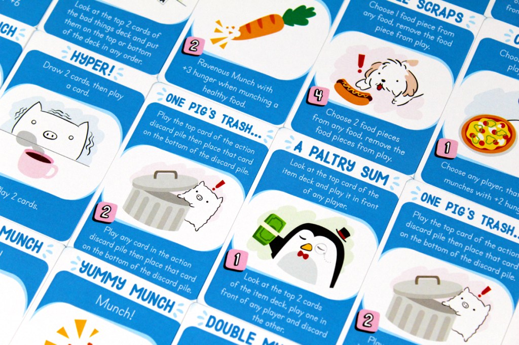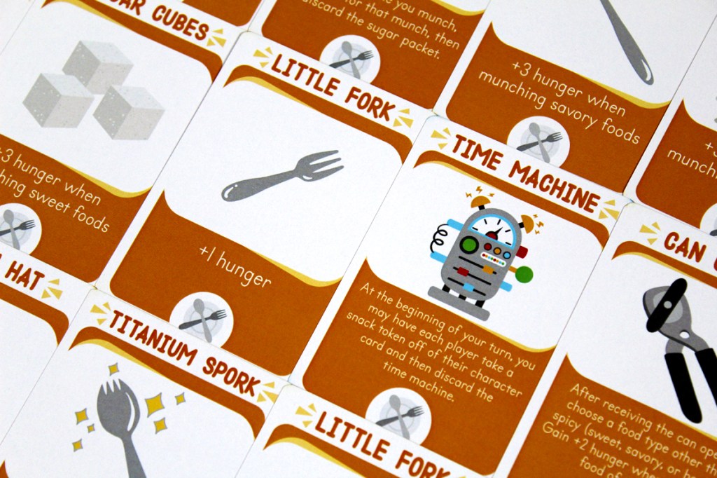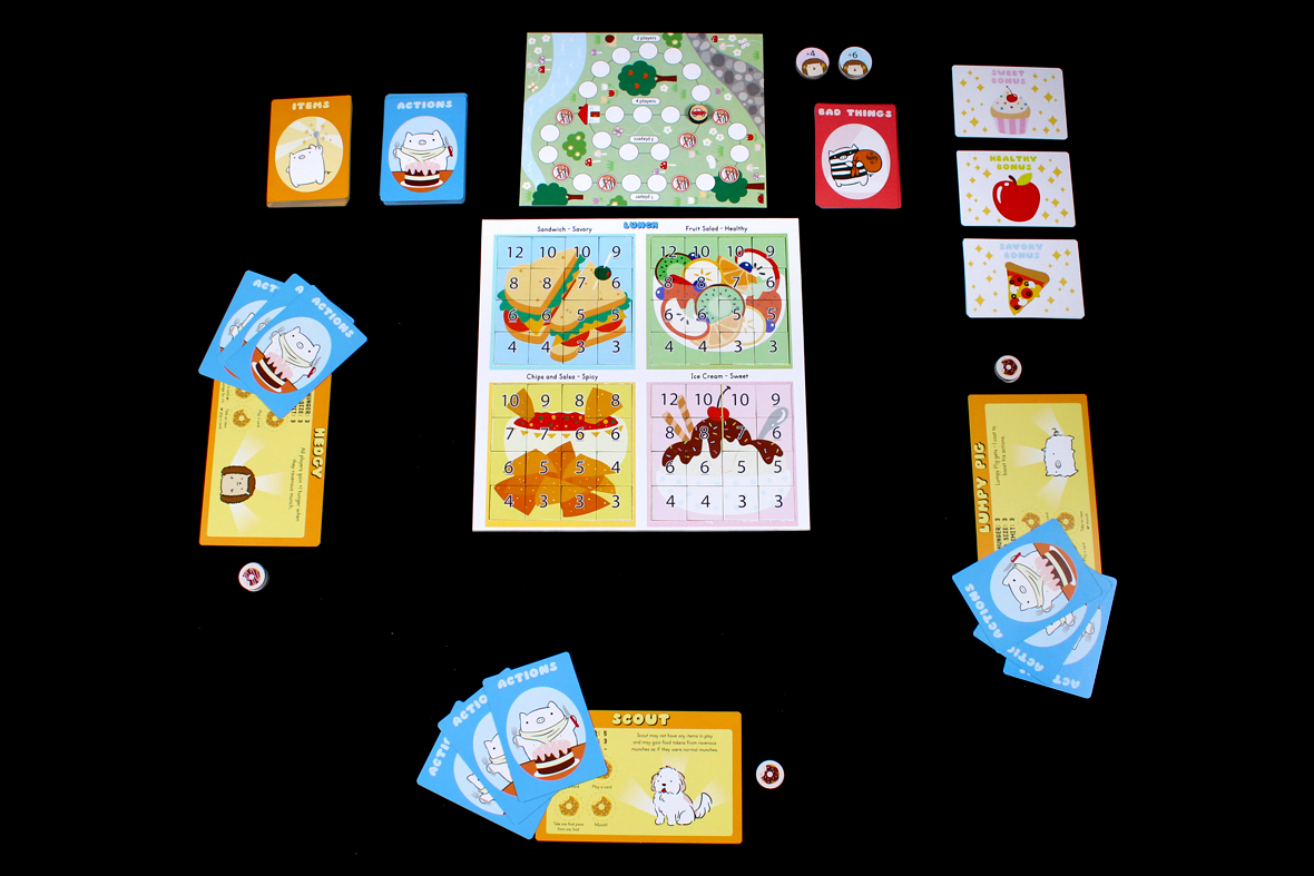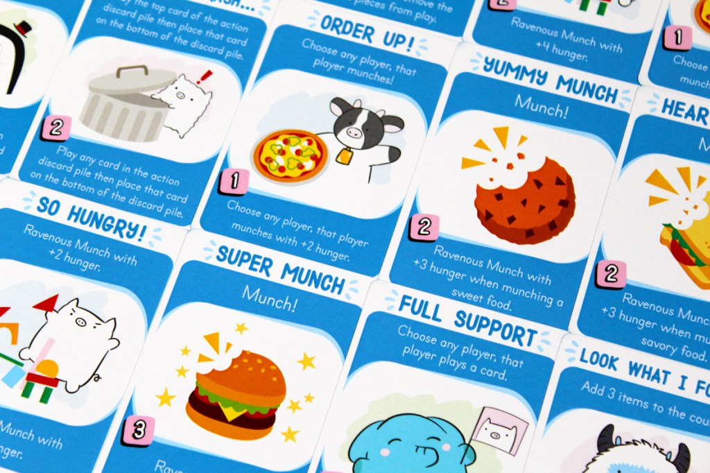 - Munch: Munching is going to be one of your primary actions during the game. To Munch, choose a food type and then remove Food Tokens from that food type whose total value is less than or equal to your Hunger Value. Note that various items / card effects / Character abilities may modify your Hunger. Any Food Tokens removed are placed on your Character card, where they can later be used to boost Action Card effects. If there are no Food Tokens available that are less than or equal to your Hunger value, this action does nothing. Taking the last Food Token of a Food Type (other than Spicy) gains you the corresponding Food Bonus! The Food Bonus card is discarded at the end of a round in which it’s activated. Fully eating every food type means you win the game!