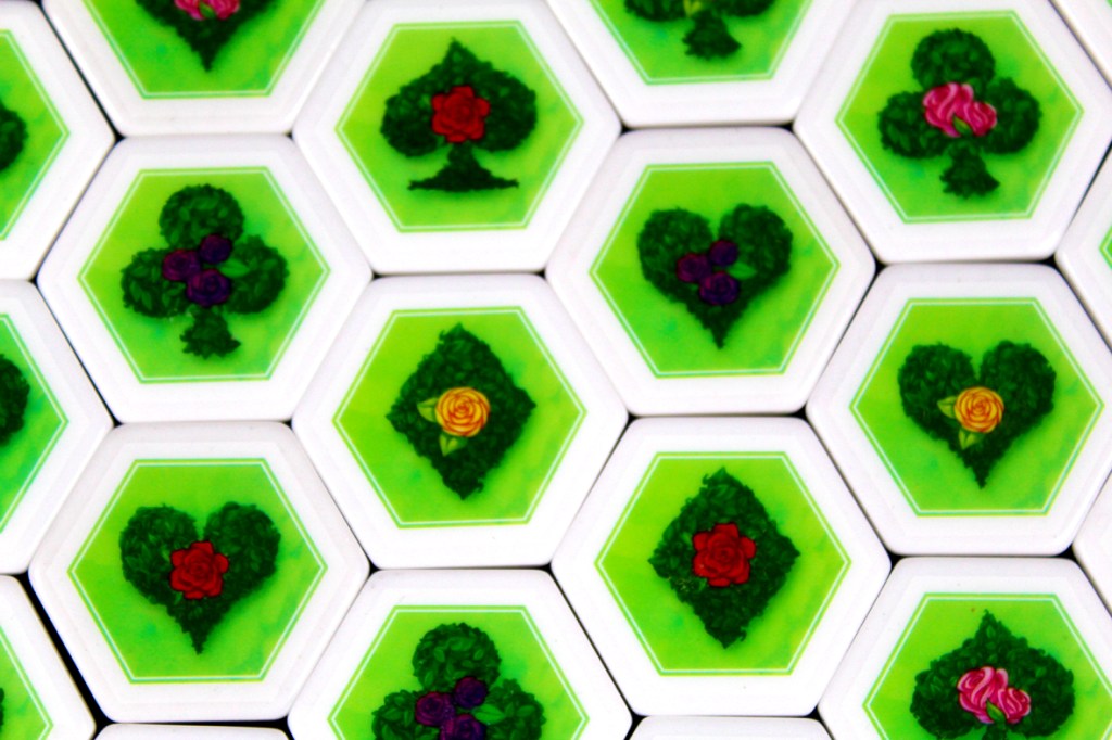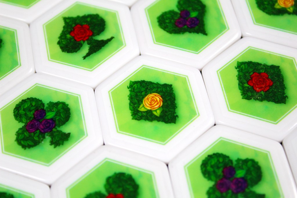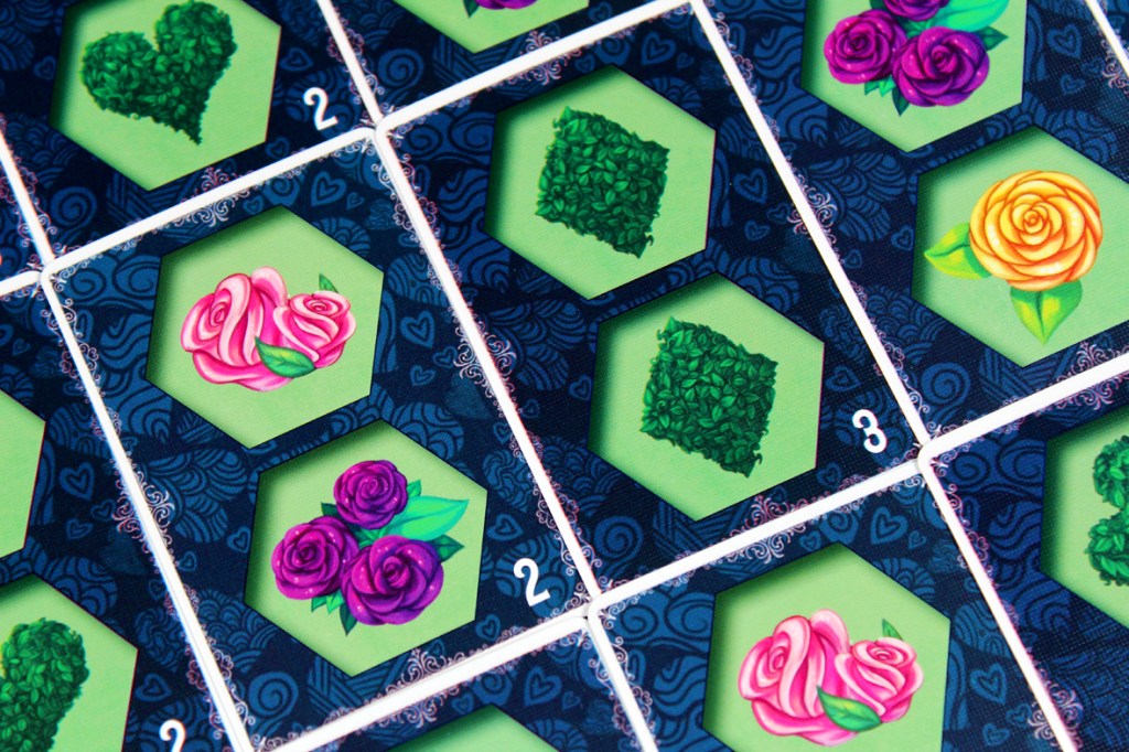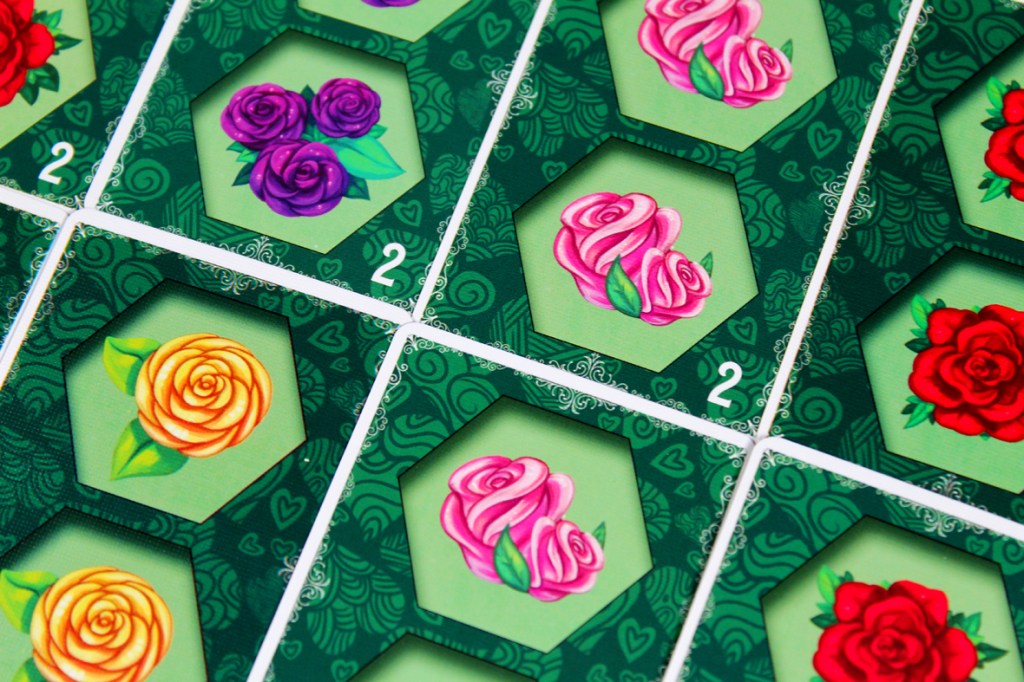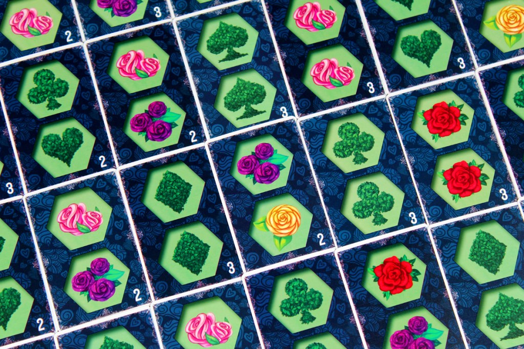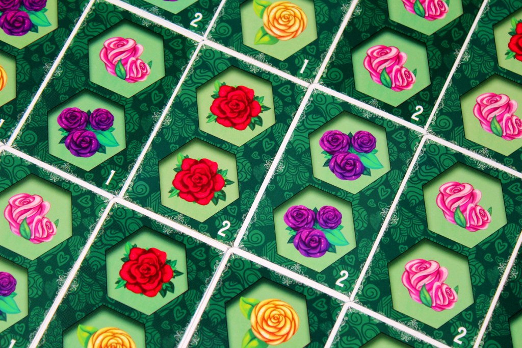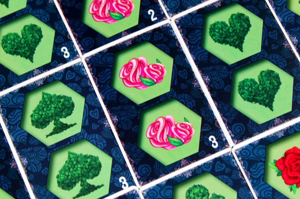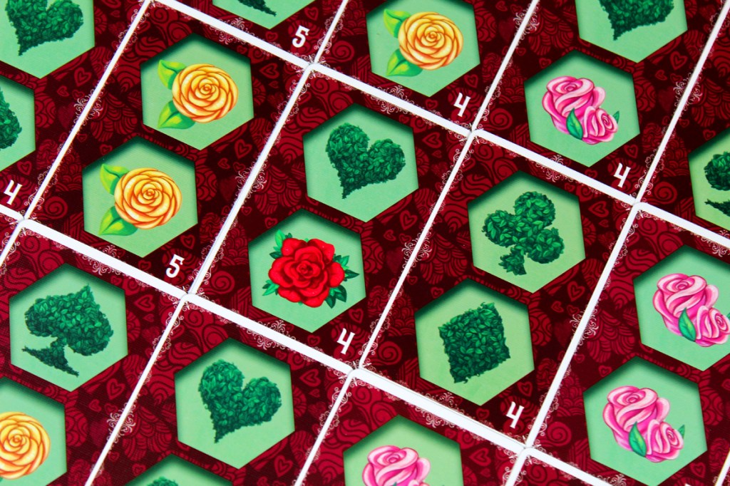I tried Paint the Roses at a few different player counts, and I think there’s a certain amount of configuration available based on how much interaction you want. At five, the game becomes highly tactical; every turn, you’re potentially getting information from up to five players. If that works out, then you’ve got a good ramp to be consistently scoring 3 – 5 points per turn. And that’s superb! You can get away from the Queen pretty quickly with an act like that. At lower player counts, you may miss on that front. That’s why a two-player game has three bailout tokens; you can spend each one once to essentially pass on a turn instead of having the Queen move double-speed. Personally, I think the game operates best at the higher end of the player spectrum; having more players makes the game more interactive, but a bit more luck-dependent; you need to hope that you either can correctly clue your card right out the gate or that your tile placement hits more than one player’s Whim Card. While I have some more structural concerns about the game (see Pros / Mehs / Cons), I think that the more players you have, the more interactive it gets, so I tend to recommend it most at five players. Two is also pretty interesting, though, so that’s probably my second choice.
