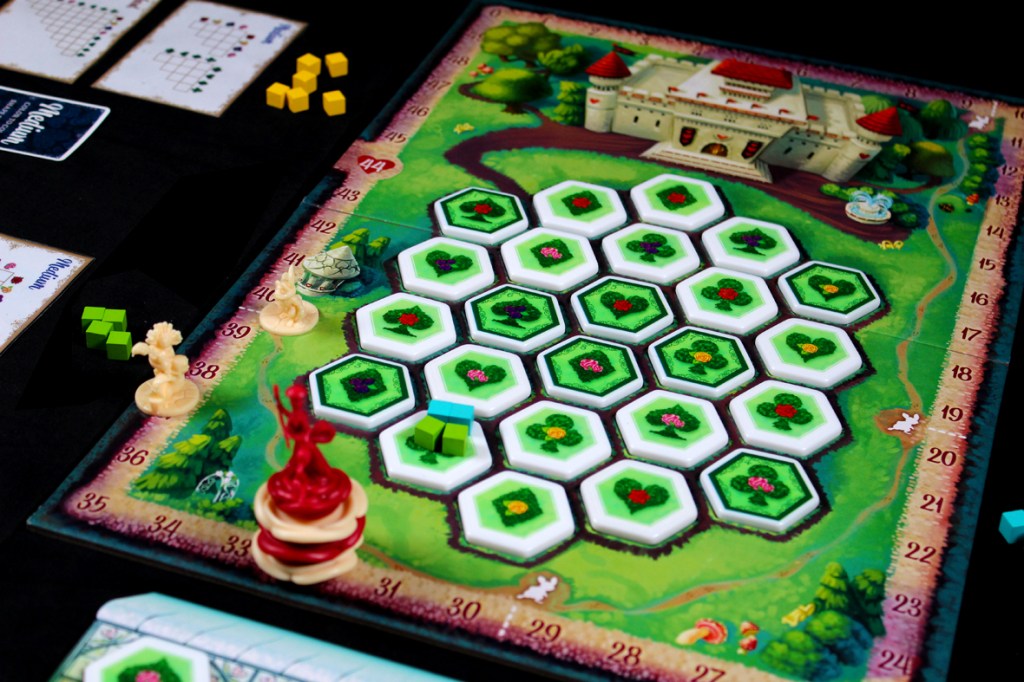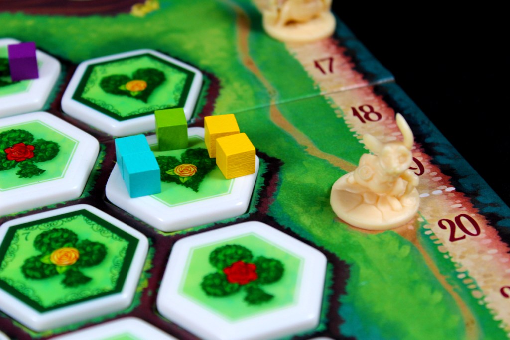 - If the Gardeners, after scoring, pass the White Rabbit, advance it to the next Rabbit Space and add a Flower to the Queen mini. If there are no flowers left, remove the White Rabbit from the board.
