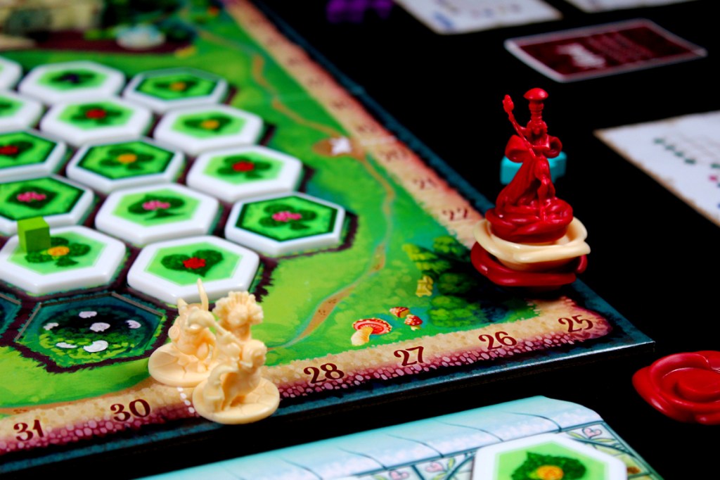 - Score points! Advance your Gardener token as many spaces as the number on the Whim Card.