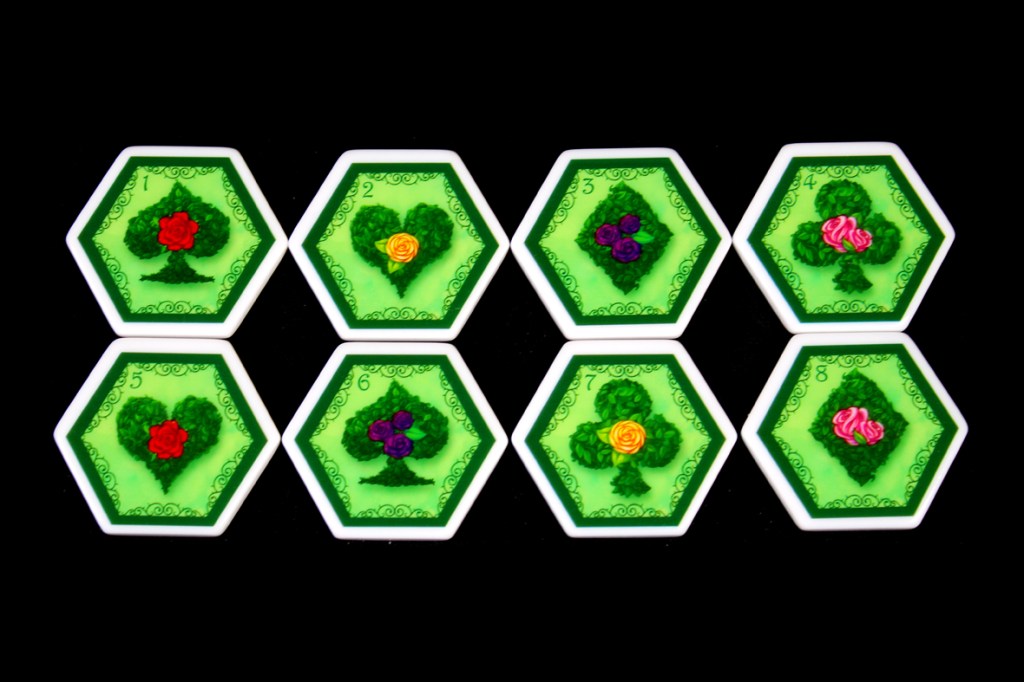 You should set aside the Queen’s flower tokens, as well; she’s not normally that tall. Once you’ve done that, give each player 6 Clue Tokens in the color of their choice:
