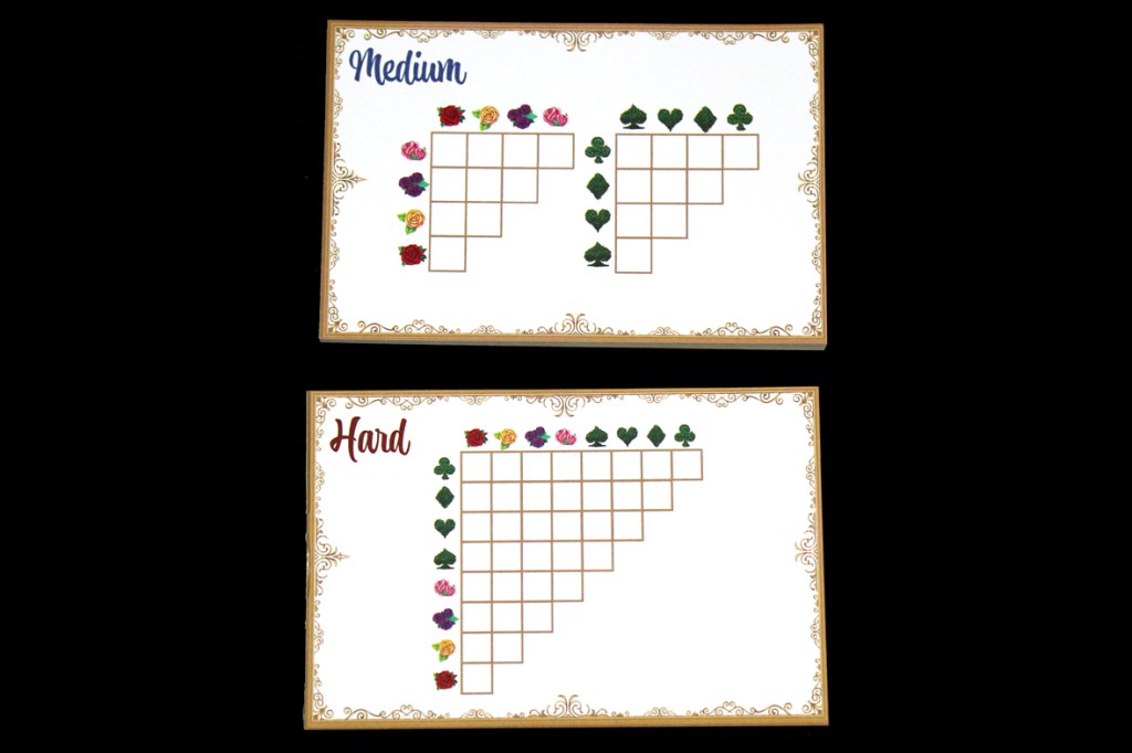 - Medium: The cards match color to color and shrub shape to shrub shape. The shapes are hearts, clubs, diamonds, and spades.