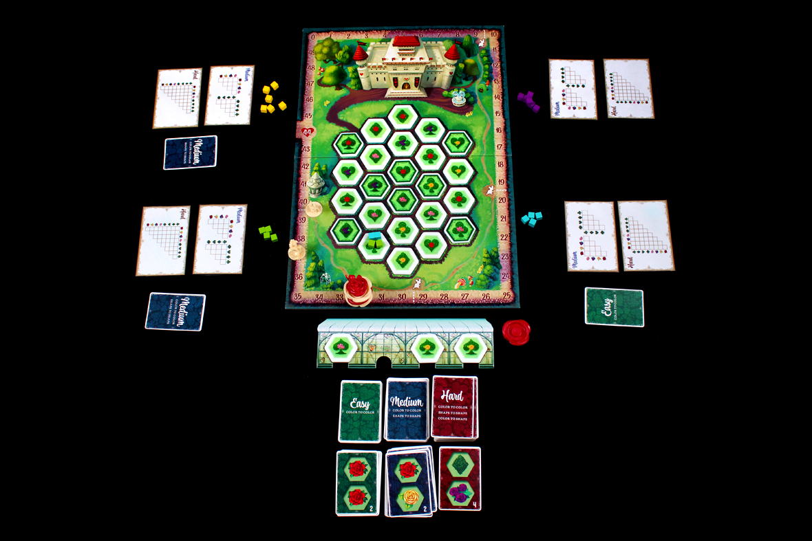 I tried Paint the Roses at a few different player counts, and I think there’s a certain amount of configuration available based on how much interaction you want. At five, the game becomes highly tactical; every turn, you’re potentially getting information from up to five players. If that works out, then you’ve got a good ramp to be consistently scoring 3 – 5 points per turn. And that’s superb! You can get away from the Queen pretty quickly with an act like that. At lower player counts, you may miss on that front. That’s why a two-player game has three bailout tokens; you can spend each one once to essentially pass on a turn instead of having the Queen move double-speed. Personally, I think the game operates best at the higher end of the player spectrum; having more players makes the game more interactive, but a bit more luck-dependent; you need to hope that you either can correctly clue your card right out the gate or that your tile placement hits more than one player’s Whim Card. While I have some more structural concerns about the game (see Pros / Mehs / Cons), I think that the more players you have, the more interactive it gets, so I tend to recommend it most at five players. Two is also pretty interesting, though, so that’s probably my second choice.