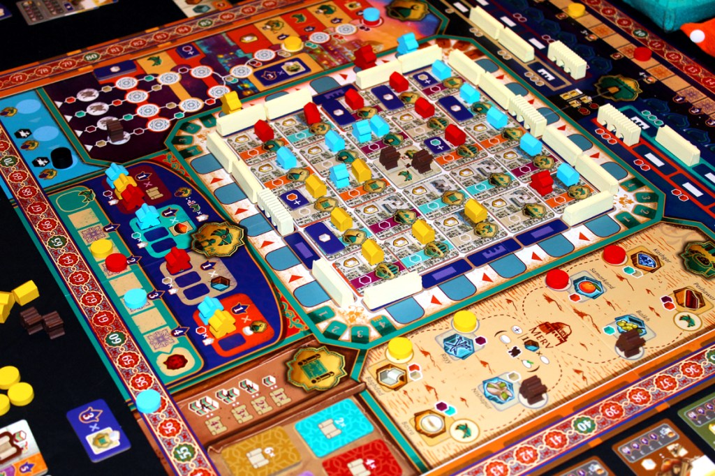 Overall, I think Merv: The Heart of the Silk Road is pretty great! Not just great, honestly; impressive. It’s always a bit tough for me to get longer games to the table, like this (hence why this review is coming out a bit after it came out), but Merv was worth the wait, for me. I think it’s part of a growing class of games that shoot to be elegant experiences and elegant presentations, like Alea’s new boxed series or some of the wooden-box games that I’ve seen coming out. Merv catches the eye in and out of the box, and it’s as striking on the shelf as it is on the table. I mean, that’s why you get Ian O’Toole, right? He’s one of the absolute best in the business (though we are blessed with an abundance of talented artists). If the game just looked good, that would be one thing, but it also plays well, too! It took me a bit of time to learn the systems, but I find their interactions extremely elegant, as any combination of them can lead to victory with the right tiles, the right players, and the right timing. Plus, you’re incentivized to help other players by getting better rewards for protecting their buildings, and I like that. It makes the game nice, and that leads to a bit less blocking and a bit less aggressive play when players feel like they owe each other. Beyond that, the resource generation is cool, the progression and upgrade tracks are interesting, and the combination of the game’s myriad elements is filtered through the rise and fall of a city, which I always love. City building is one of my ongoing favorite genres, and I think Merv allows you to experience building and destroying one in a way that’s super engaging and interesting. I loved playing Merv, and I can’t wait to play it again once I can justify the heavier gameplay to some of my gaming friends. In the meantime, however, if you’re looking for a compelling game, a beautiful experience, or you just like turning resources into resources into points, Merv might be up your alley! I’ve certainly had an excellent time with it.